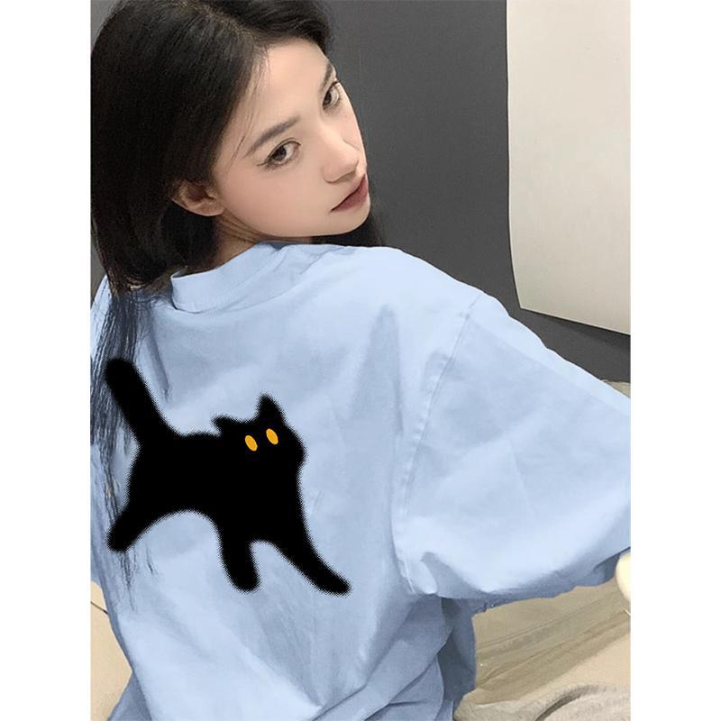 蓝色圆领短袖T恤女夏季爆款新款多巴胺宽松休闲潮牌纯棉上衣