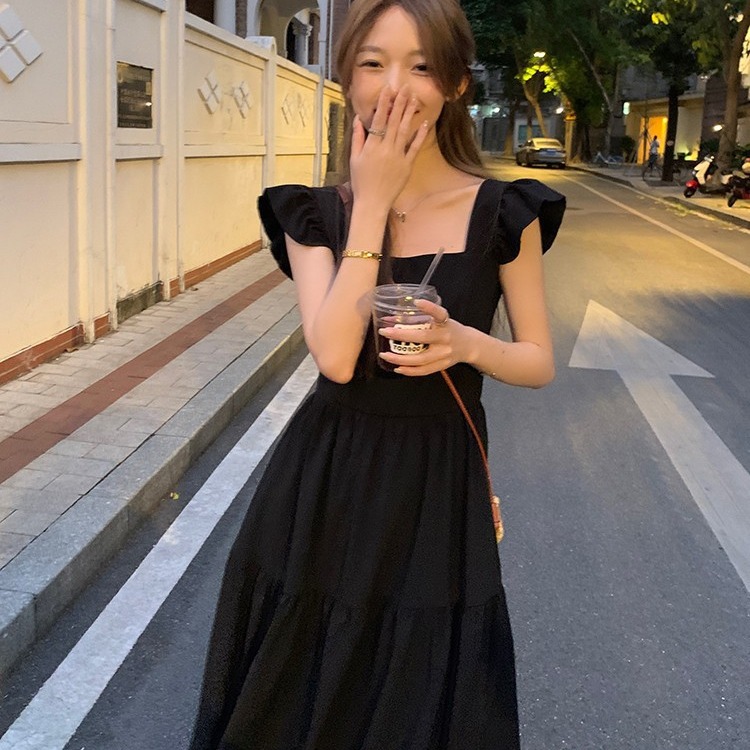 方领黑色小飞袖连衣裙女装夏季法式复古高级感气质收腰显瘦小裙子