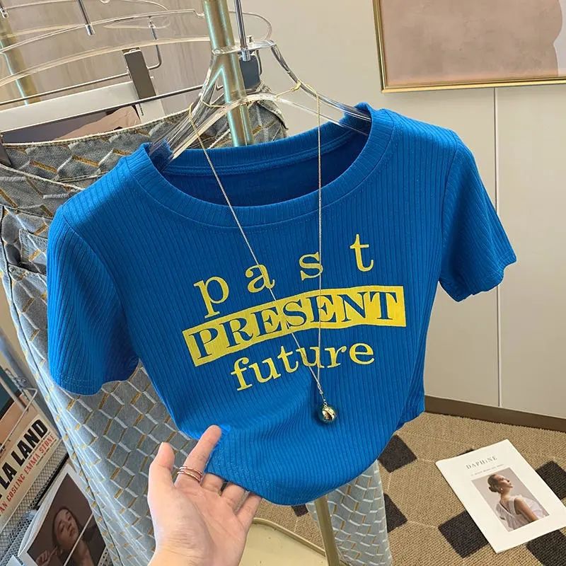 韩版圆领撞色小众设计感短袖T恤女夏季新款修身显瘦百搭上衣