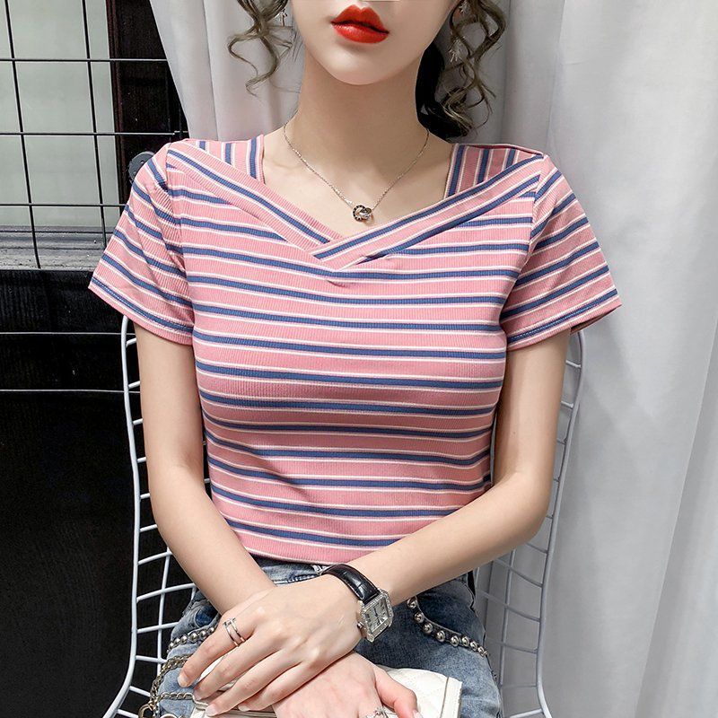 V领条纹短袖t恤女夏季新款韩版宽松百搭气质打底衫上衣ins潮