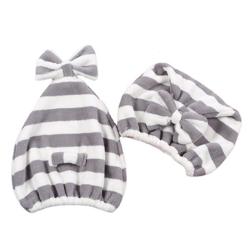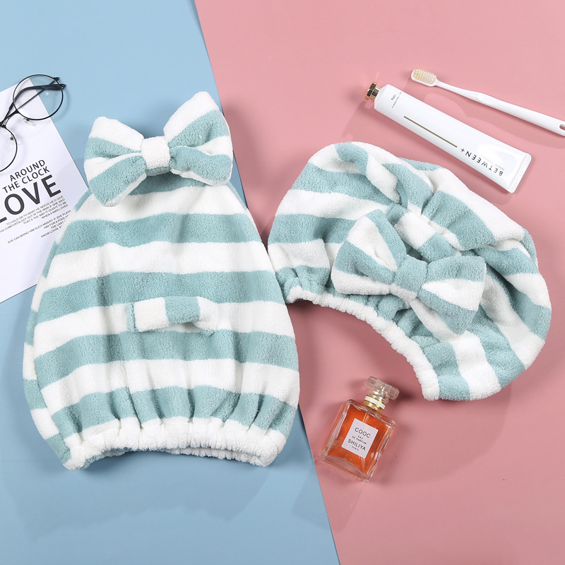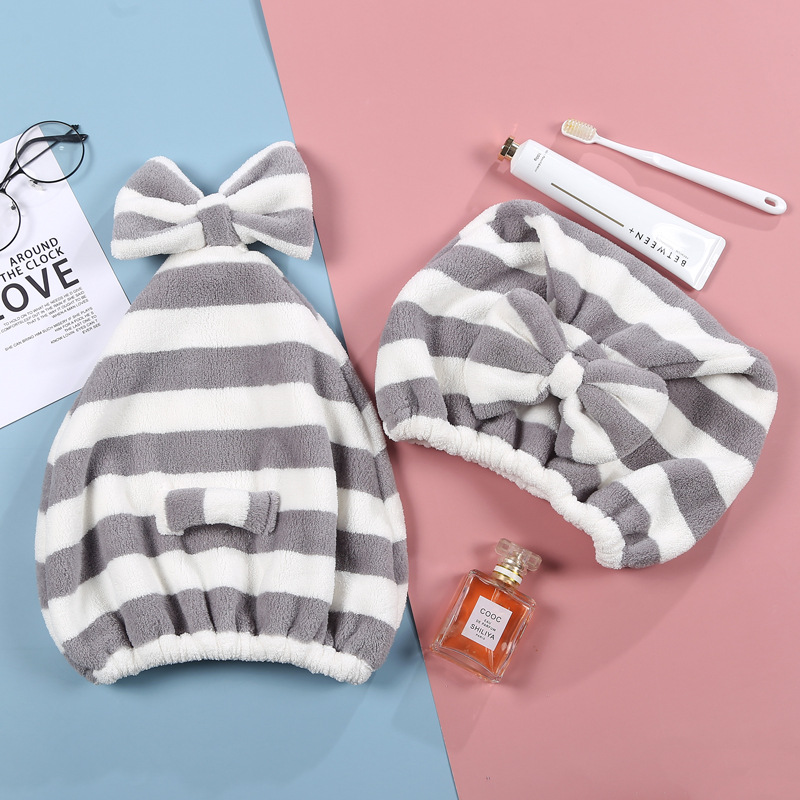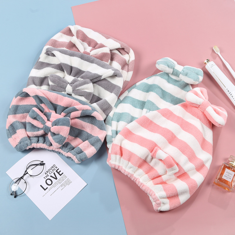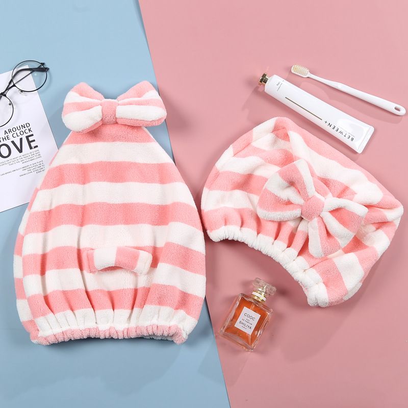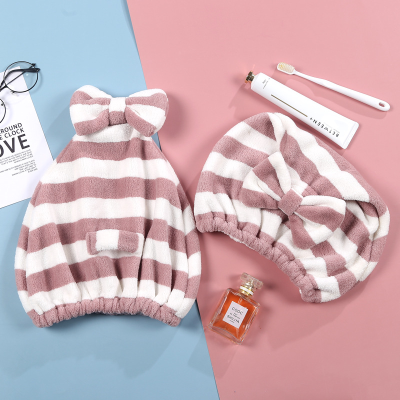 珊瑚绒阳离子蝴蝶结干发帽 吸水速干条纹干发巾公主浴帽