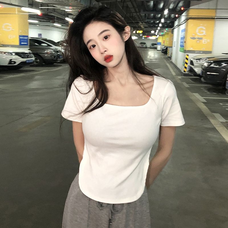 正肩方领短袖T恤女夏季新款白色显瘦短款修身弧形下摆上衣桖