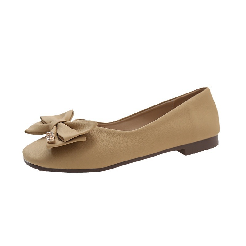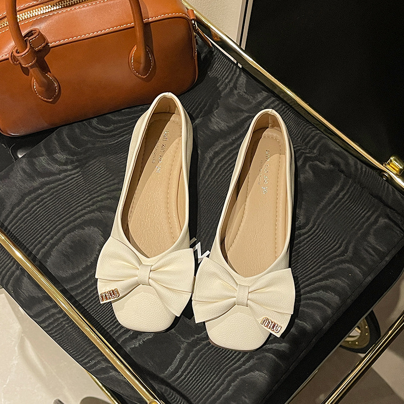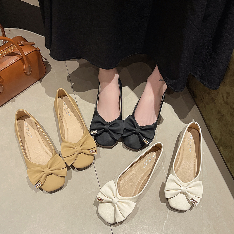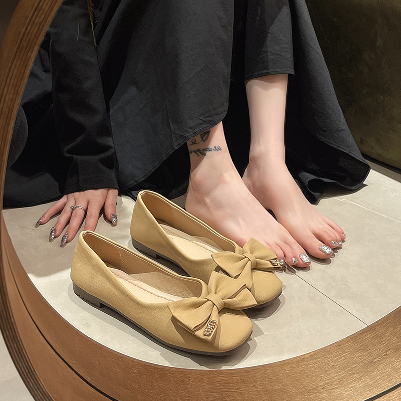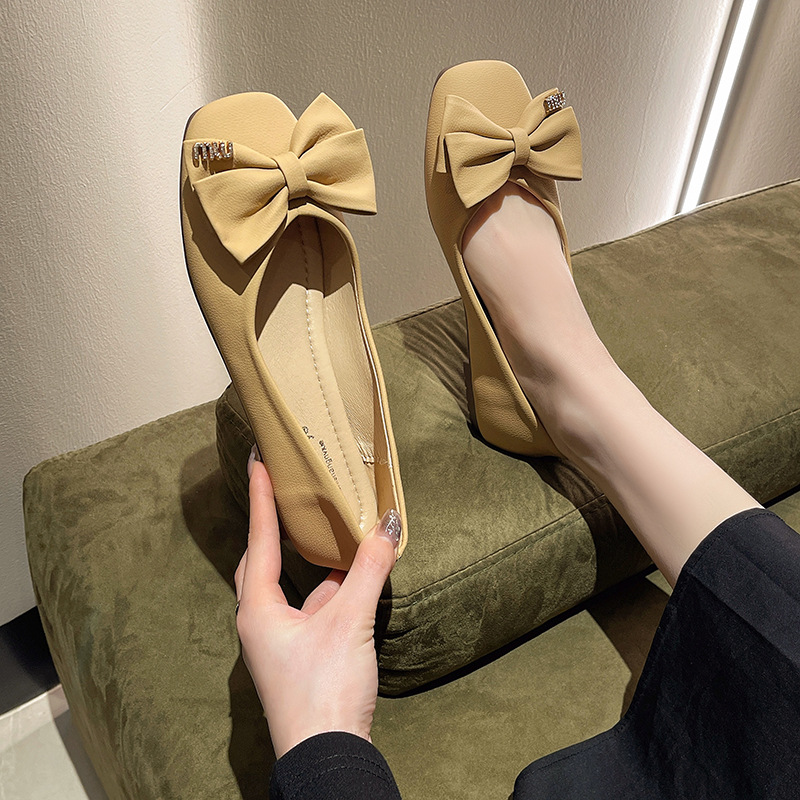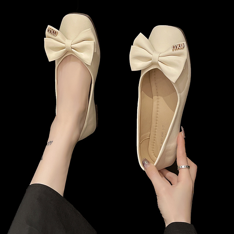 蝴蝶结方头浅口单鞋女年新款春秋软底豆豆鞋法式晚风仙女瓢鞋