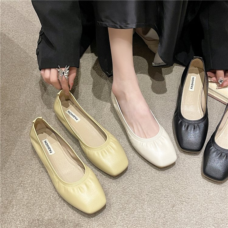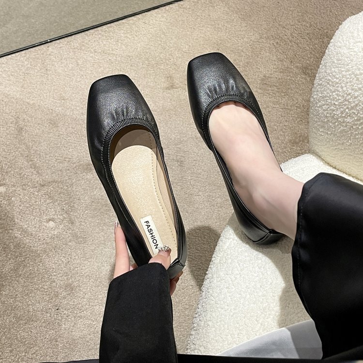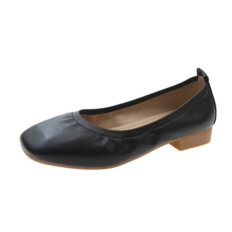 夏季新款低跟单鞋女方头浅口豆豆鞋松紧口套脚软底奶奶鞋