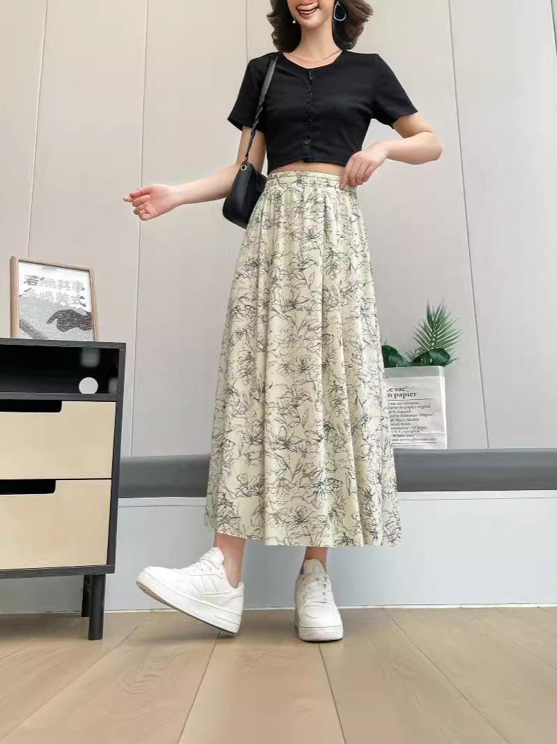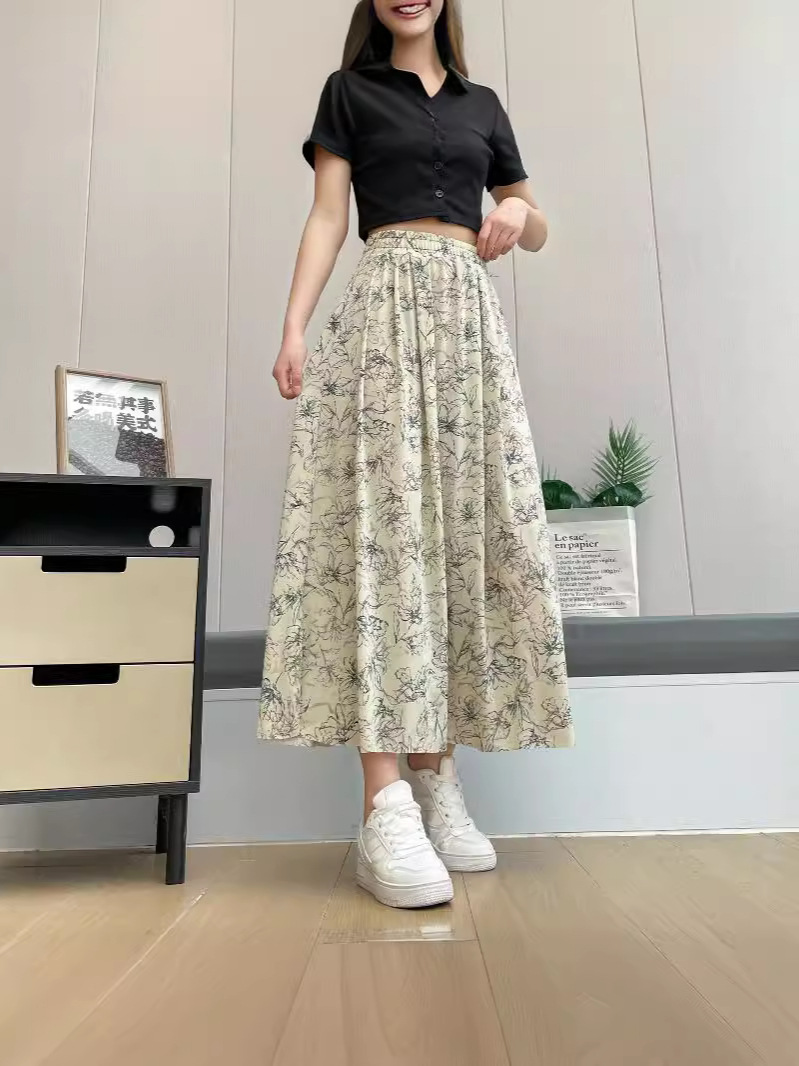 夏季国风新中式半身碎花裙甜美印花裙高弹女士大摆裙