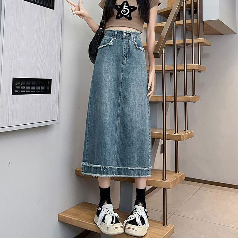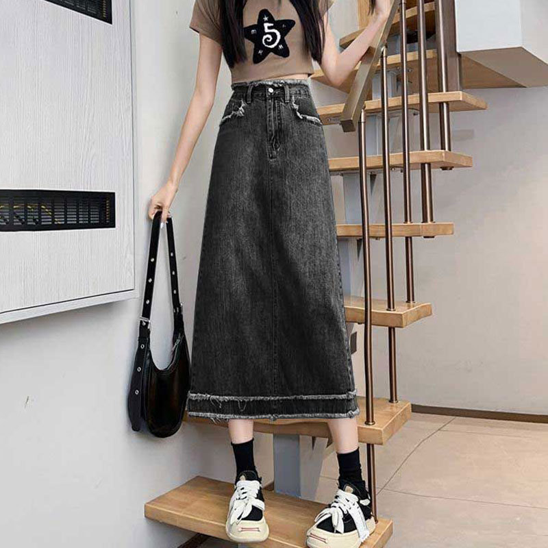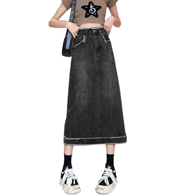 毛边牛仔裙女新款ins风百搭高腰直筒黑灰遮胯a字中长半身包臀裙子