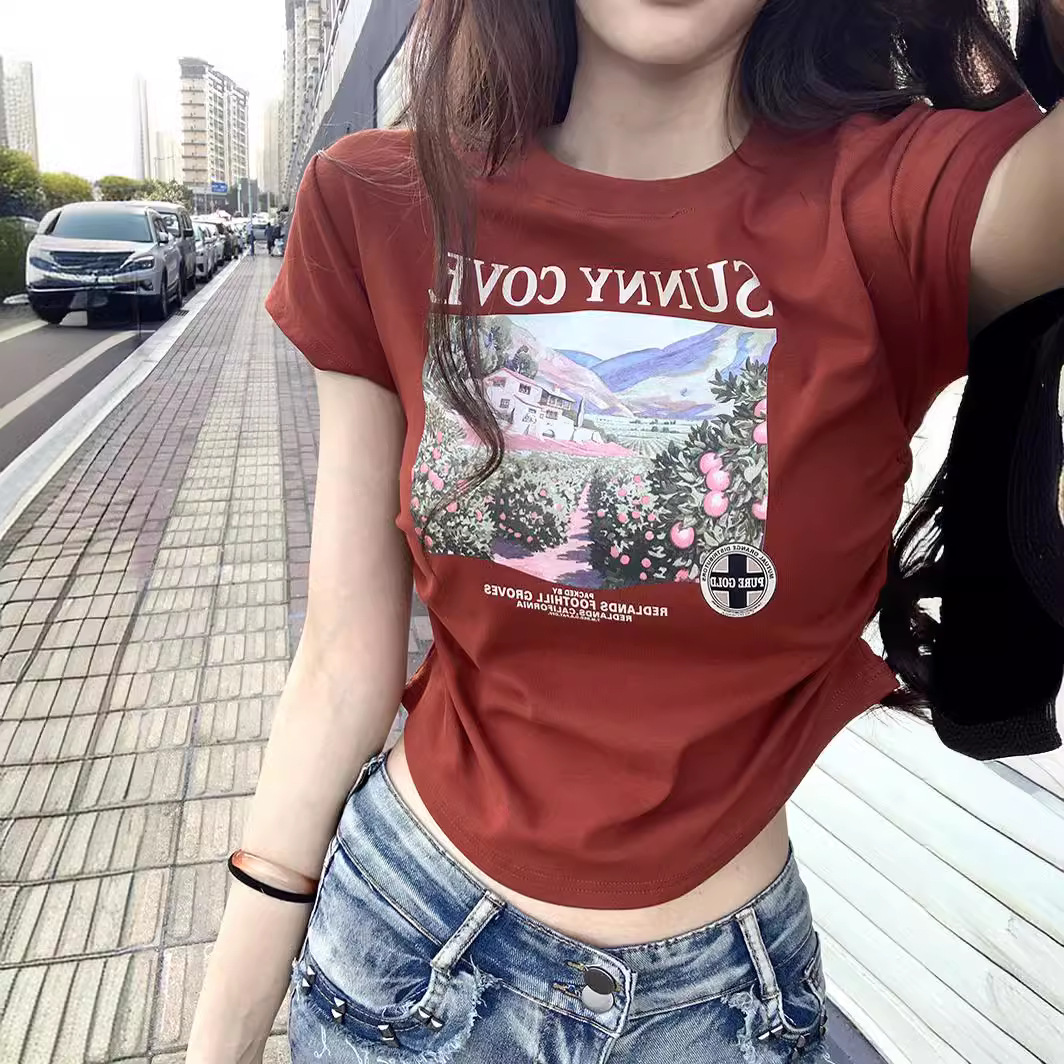 美式复古印花正肩下摆抽绳短袖正肩T恤女夏季修身显瘦短款上衣潮