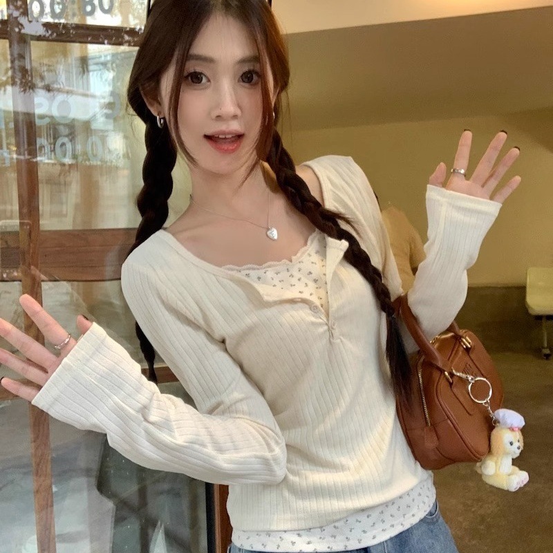 假两件蕾丝修身碎花拼接纯欲风辣妹正肩短款长袖T恤女上衣欧货潮