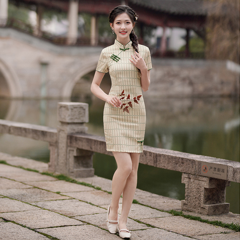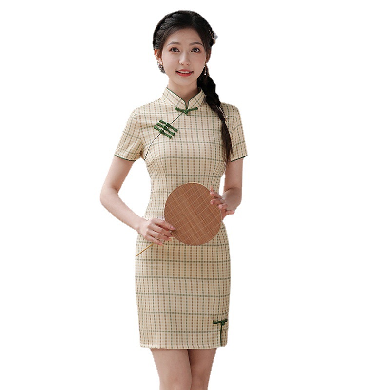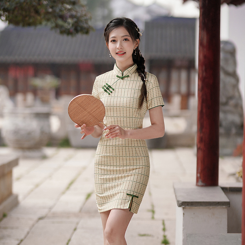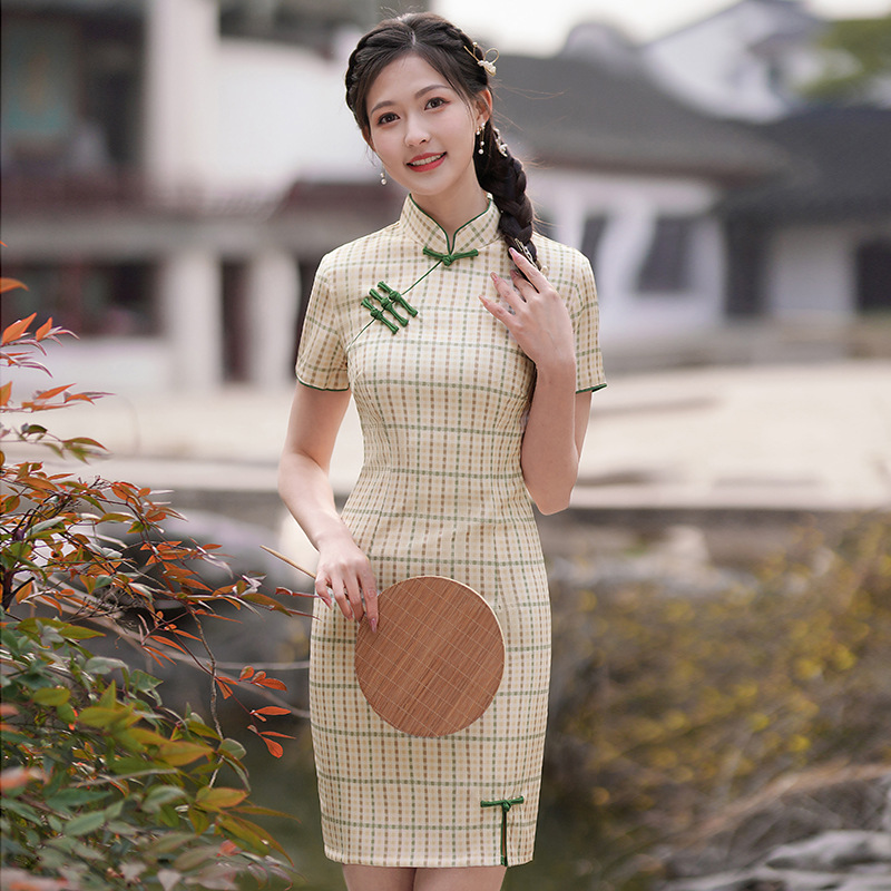 春夏季改良版旗袍日常女装短款格子年轻款少女优雅气质中国风
