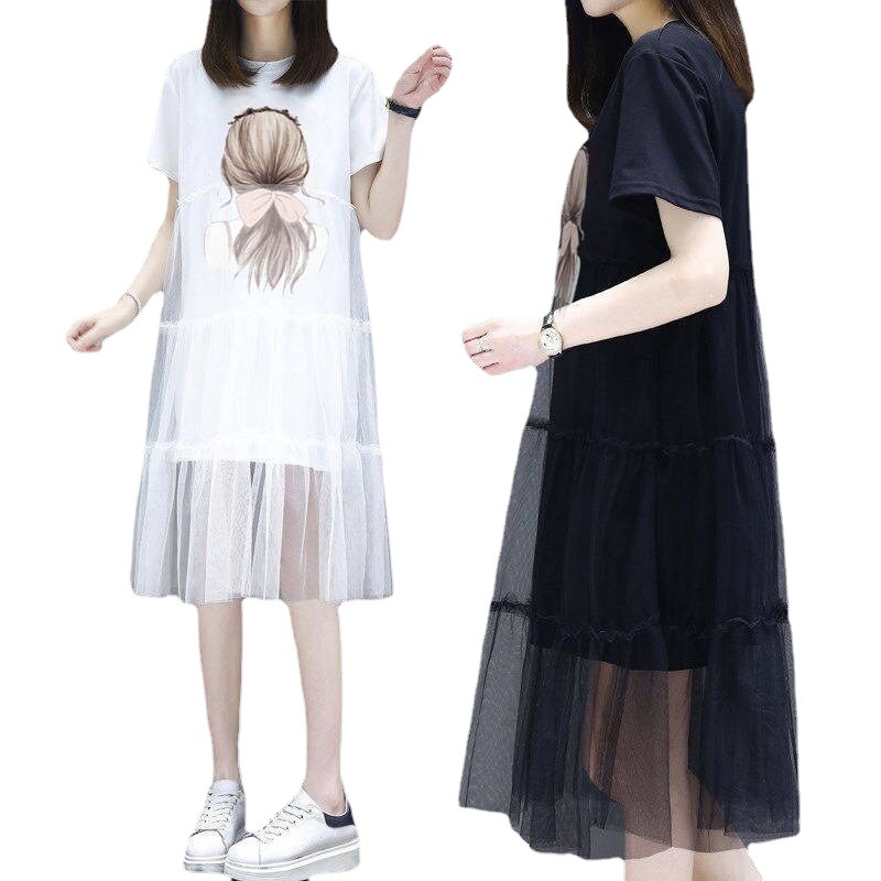 女装胖mm夏季新款200斤宽松藏肉网纱拼接连衣裙