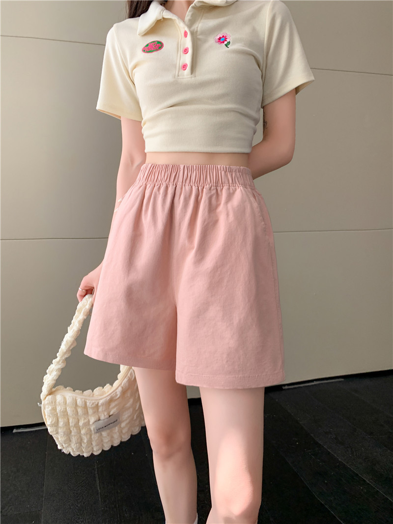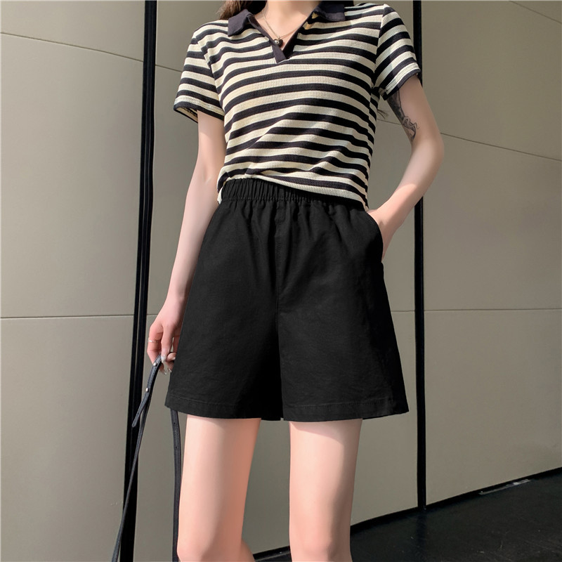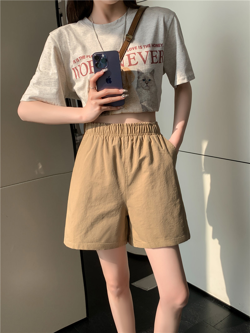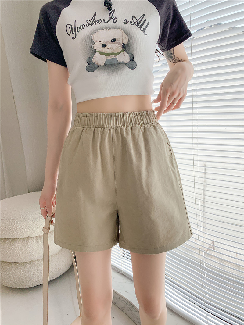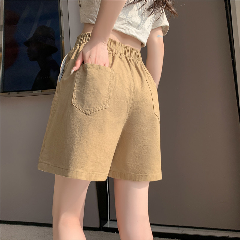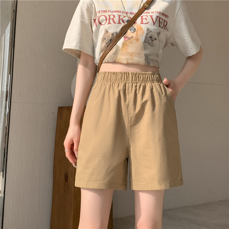 松紧高腰阔腿裤春夏日系百搭宽松显瘦休闲卡其色水洗棉短裤女夏季