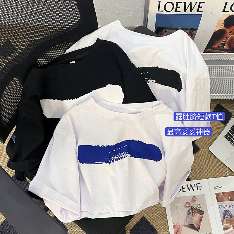 辣妹夏季短款短袖T恤女宽松显瘦街头风创意印花高腰露肚上衣