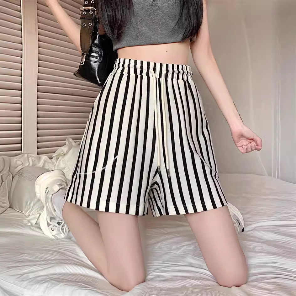 韩系宽松百搭休闲裤女夏季小个子高腰松紧抽绳肌理感阔腿直筒短裤