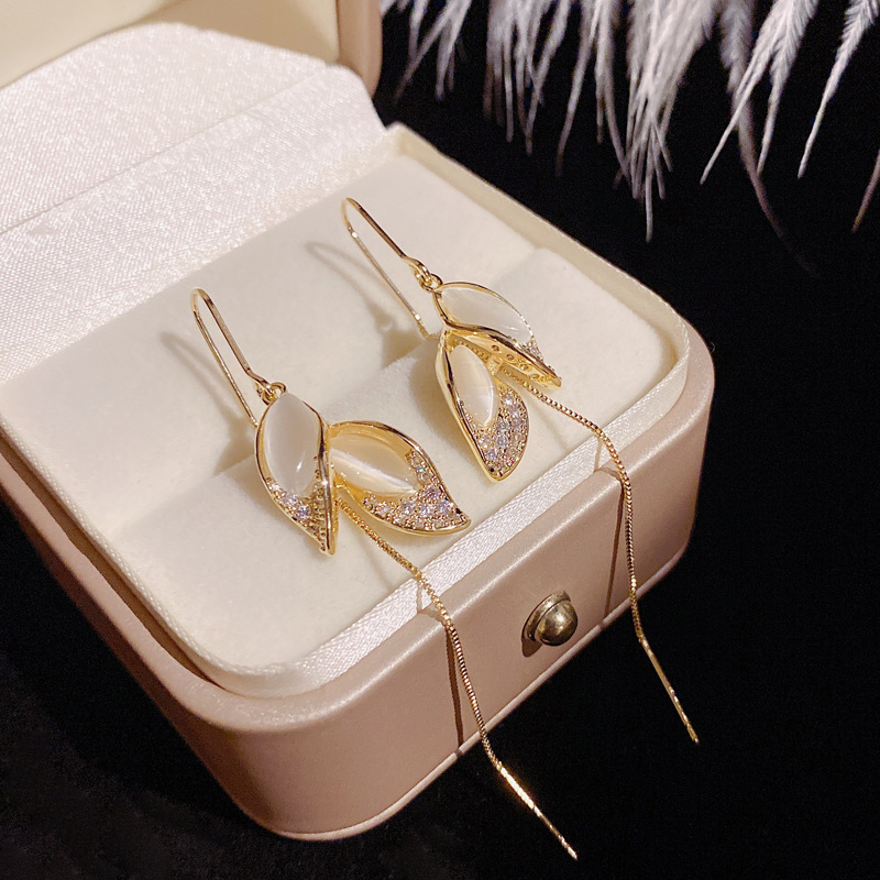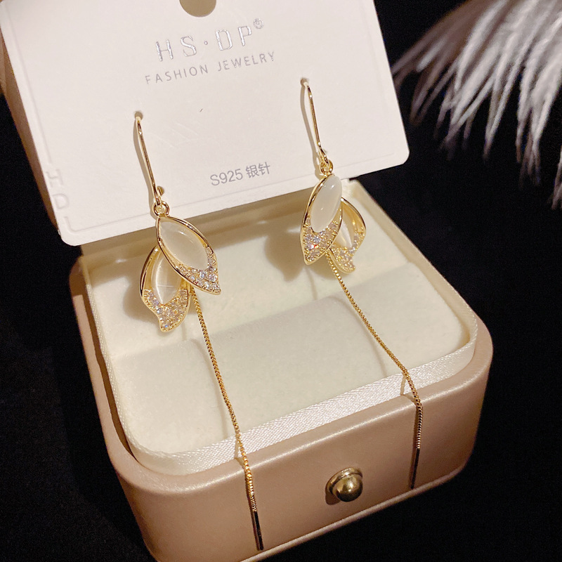 年新款气质简约猫眼石树叶流苏耳线女网红抖音同款长款耳环女