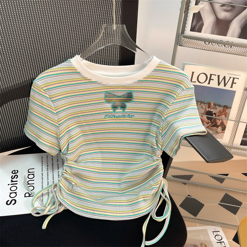 纯棉条纹短款T恤女小众设计感甜辣妹绑带短袖正肩镂空蝴蝶上衣夏