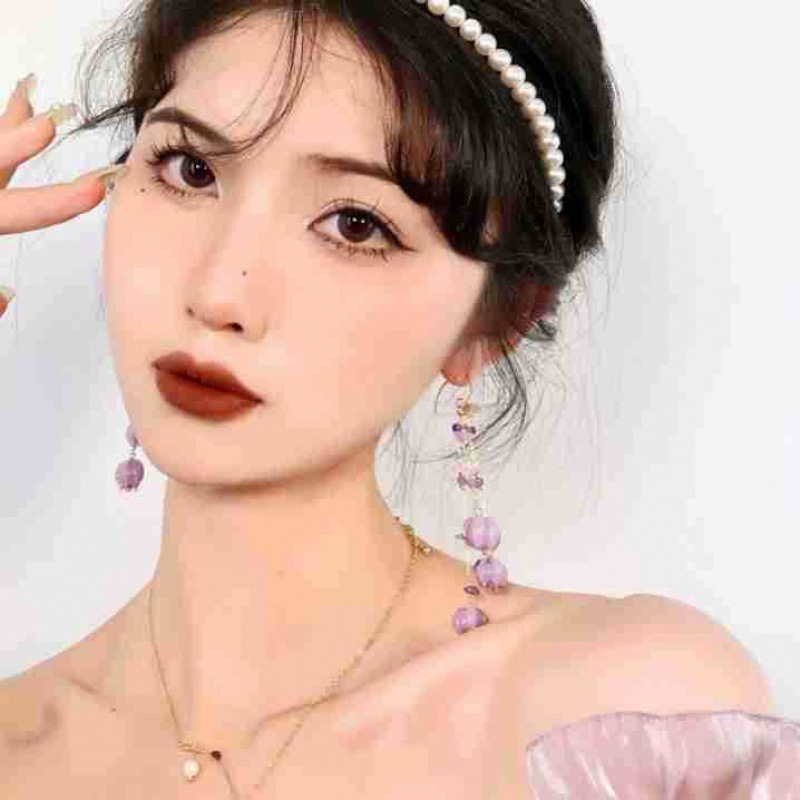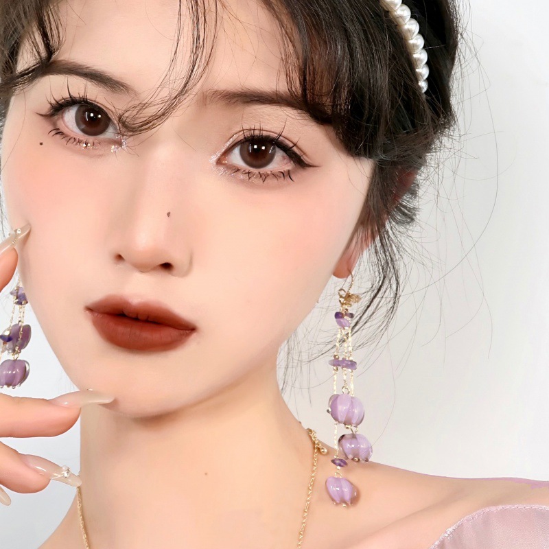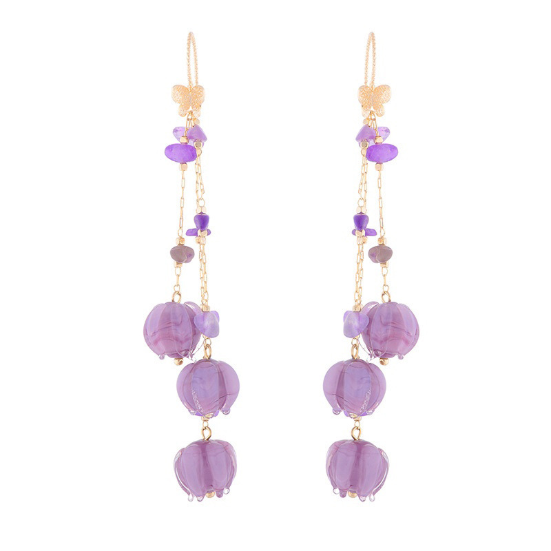 铜合金烟紫铃兰优雅耳钉复古琉璃流苏耳饰超仙时尚长款气质耳坠女