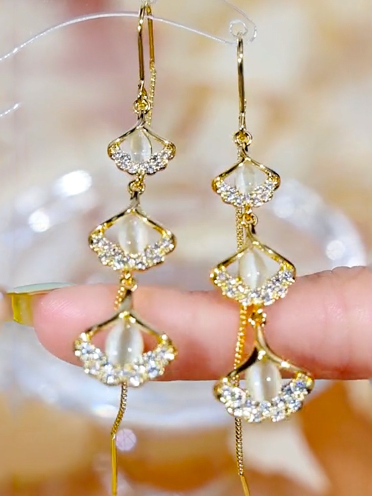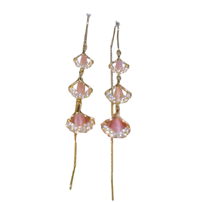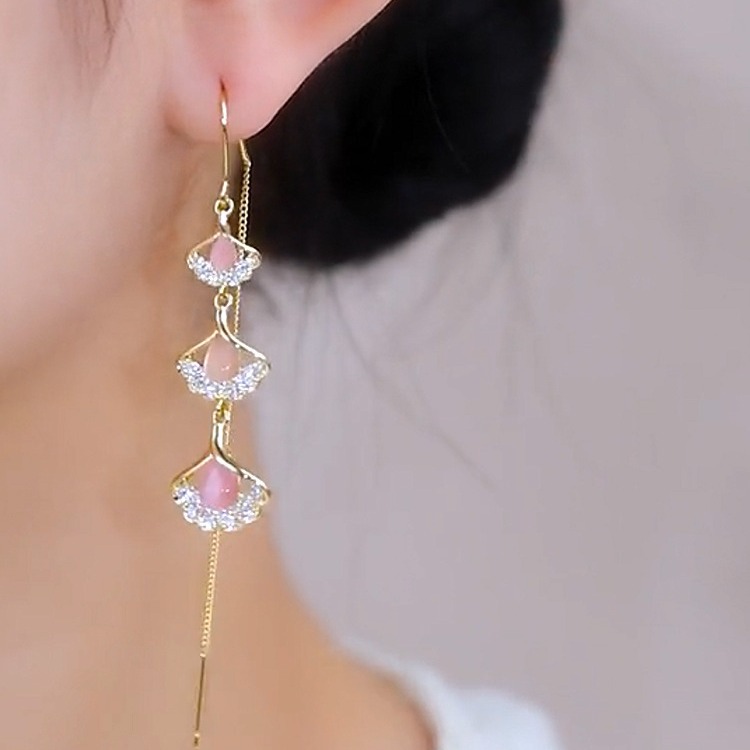 超仙粉色银杏叶防丢耳线女年新款长款流苏耳环民族风时尚耳饰