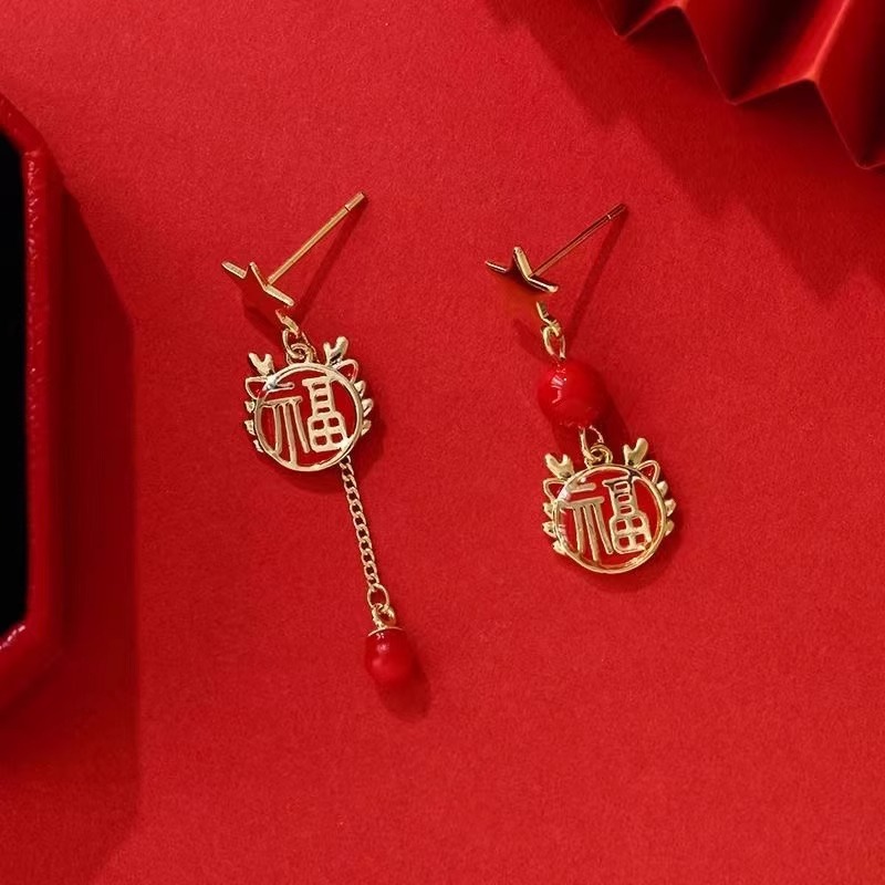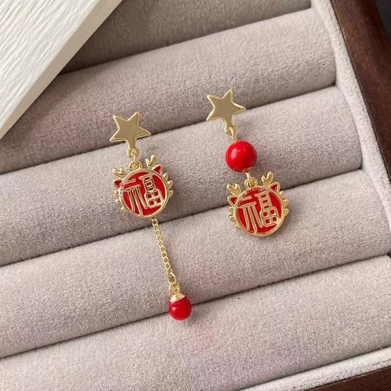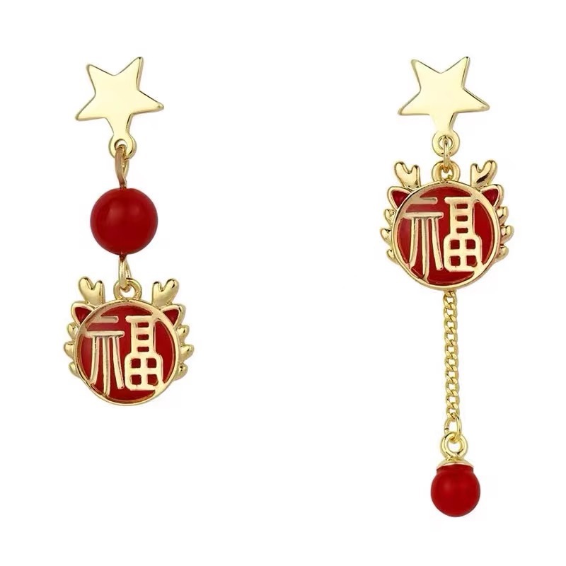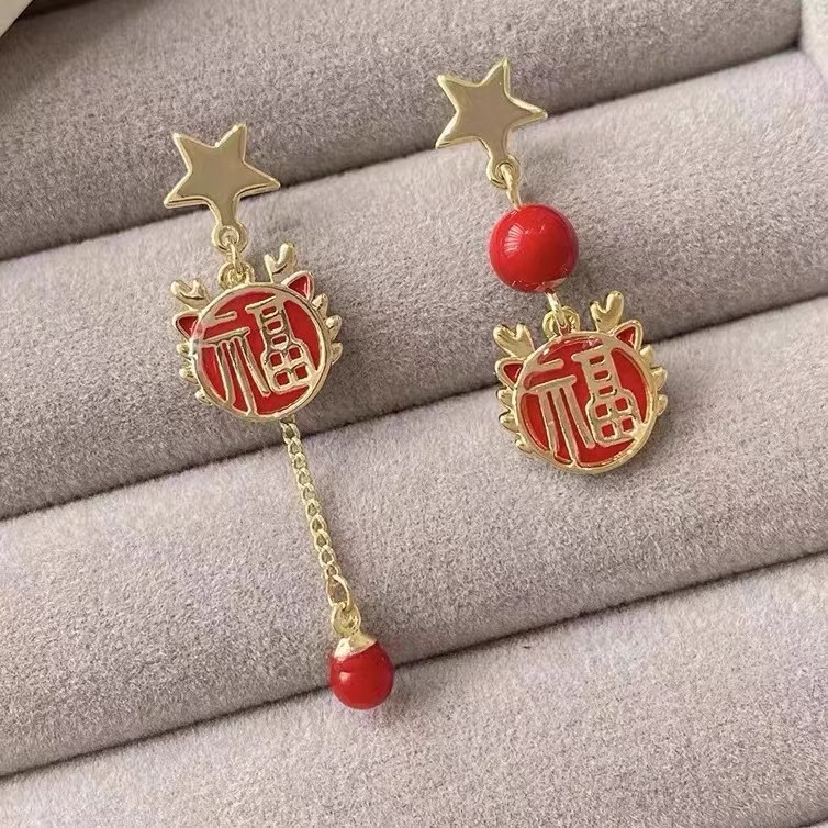 龙年本命年耳环不对称设计感红色耳坠高级感新中式国风耳饰女新年