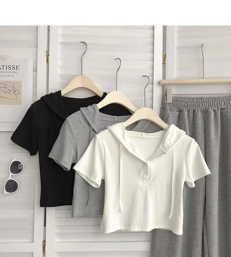23新款纯欲风辣妹连帽T恤女短袖夏季新款韩版减龄纯色短款上衣潮