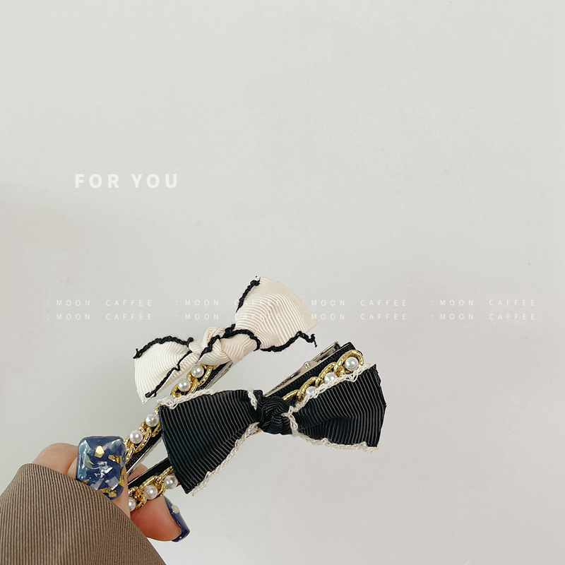 韩国新款小香风蝴蝶结布艺珍珠一字夹鸭刘海夹发卡发夹新