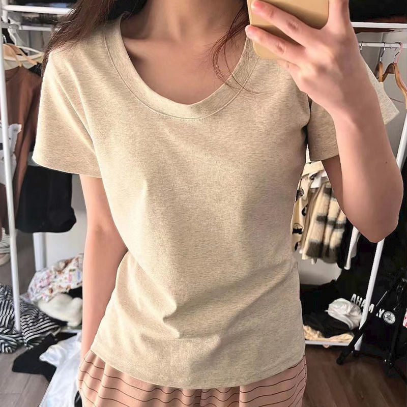 Exposed collarbone U-neck T-shirt ដៃខ្លីរបស់ស្ត្រីកំពូលស្មាស្តើងពណ៌ប្រផេះរដូវក្តៅថ្មីពណ៌រឹងអាវមូលដ្ឋានរាងកាយ ins