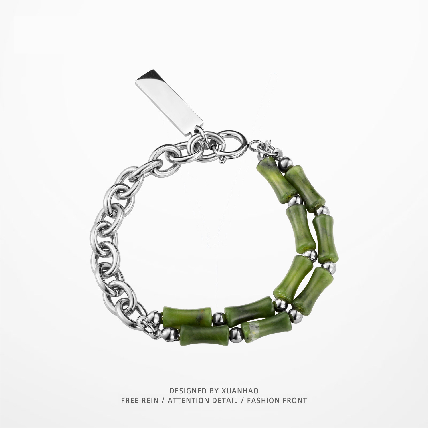 轩皓 橄榄绿竹节天然石叠戴手链 潮男女不锈钢手环小众高级感手串