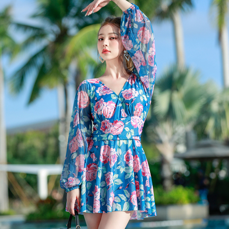 连体平角游泳衣保守显瘦遮肚韩版加肥加大长袖胖妹妹温泉泳装