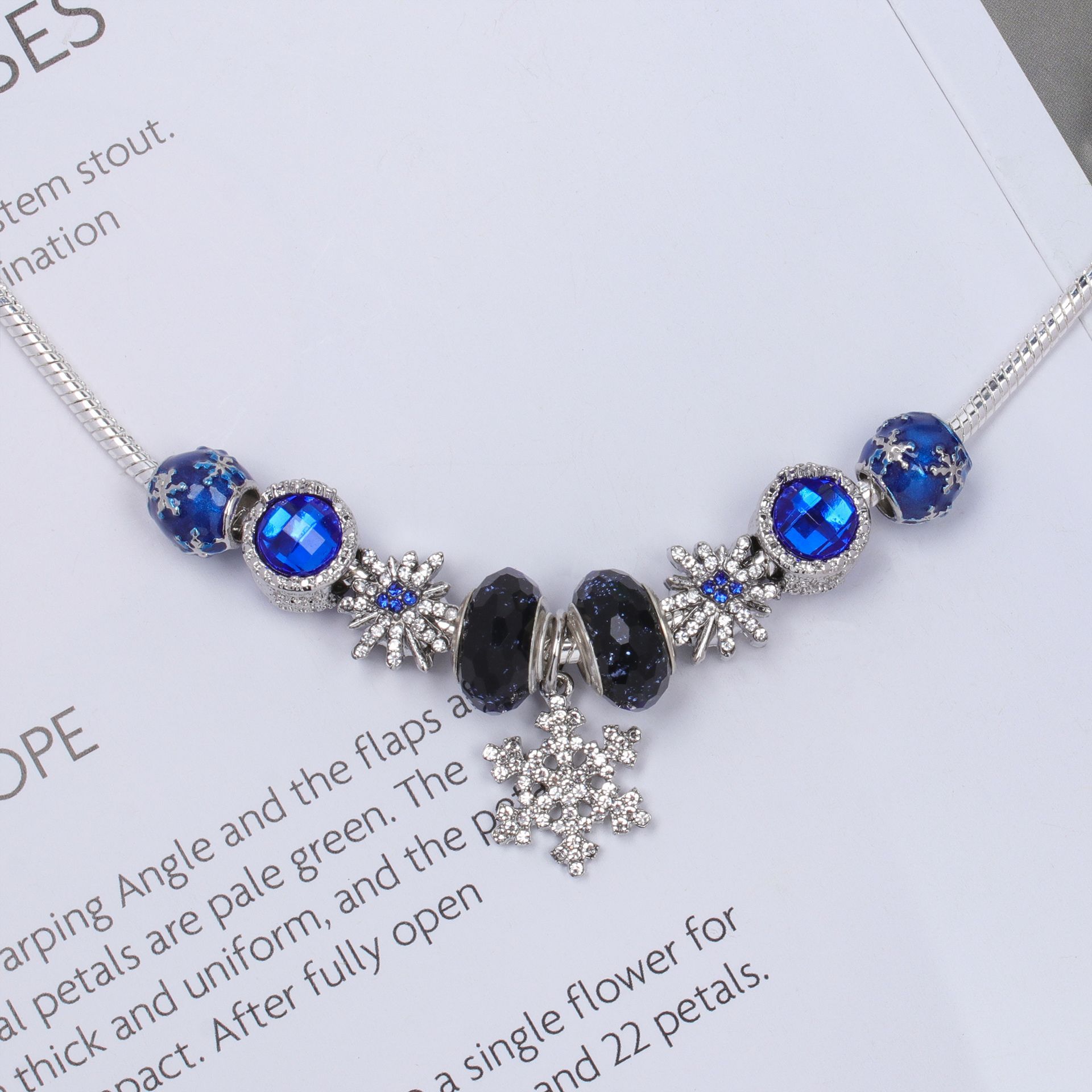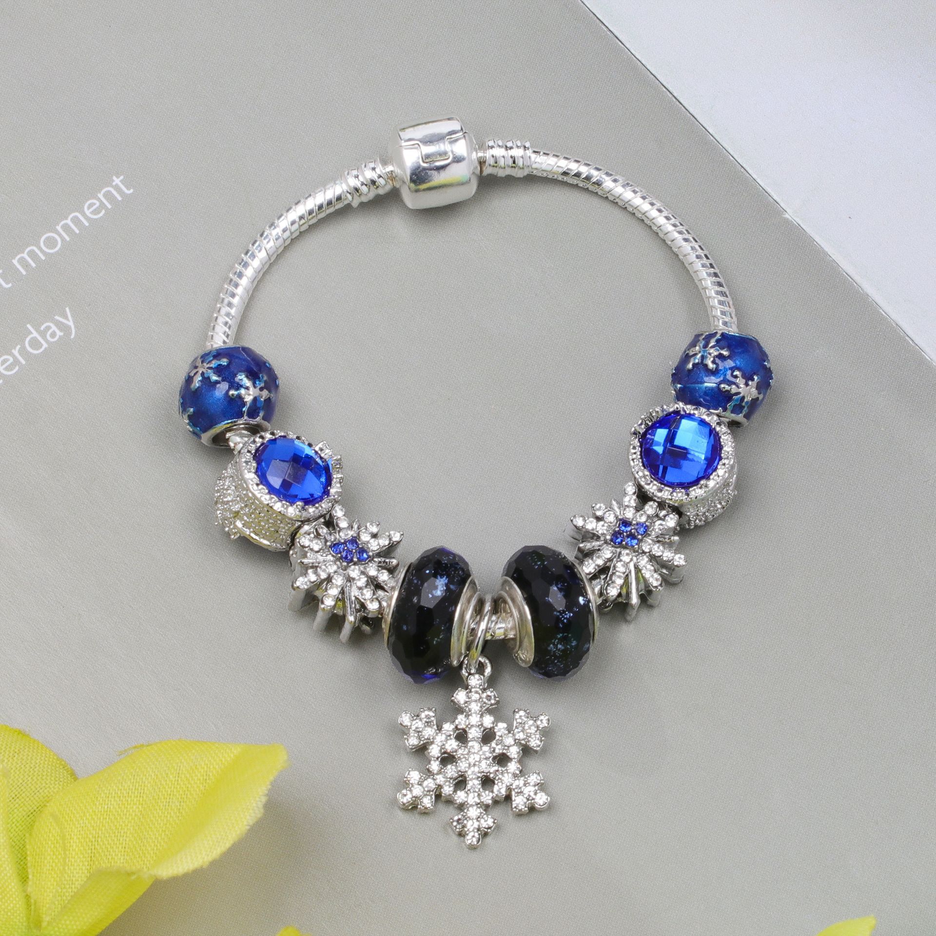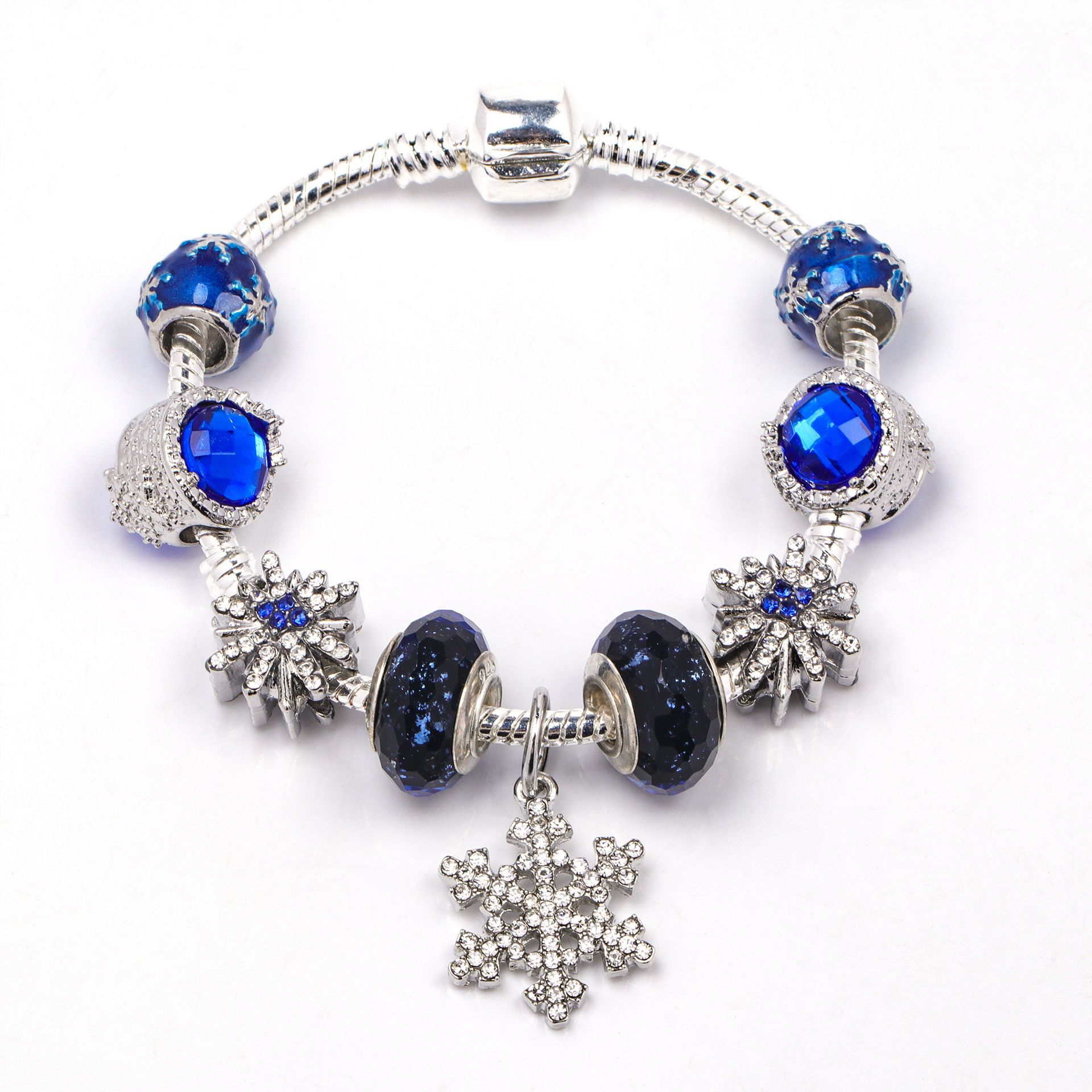 欧美潘家蓝色切面猫眼石琉璃珠串珠手链 diy镶钻合金雪花吊坠手串