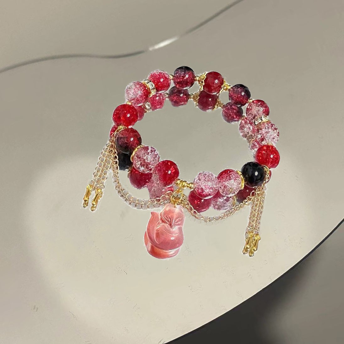 长月烬明翩然同款玫红水晶串珠手链轻奢小众精致小狐狸吊坠手环潮