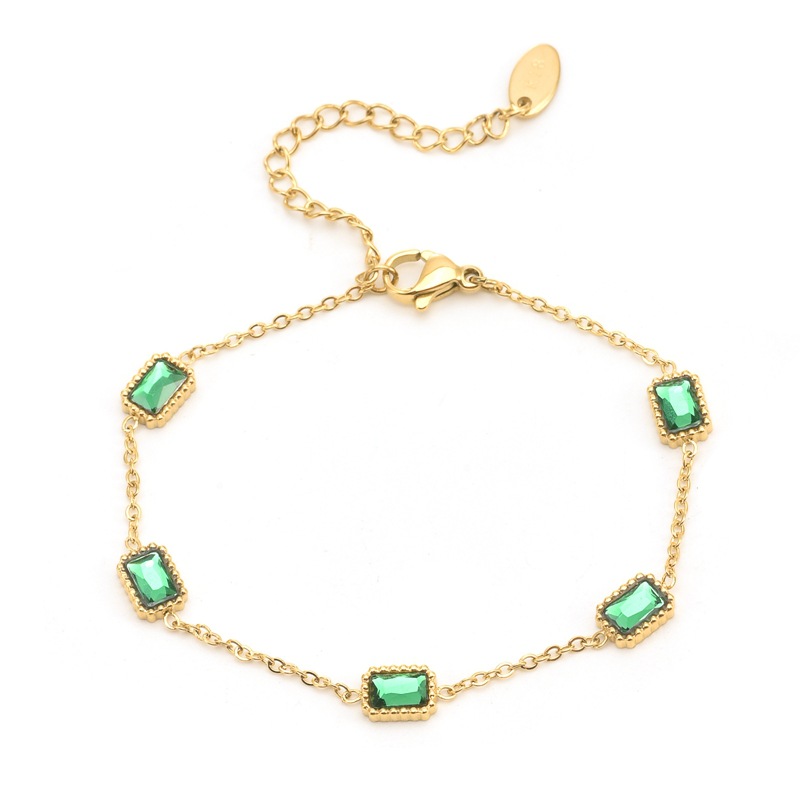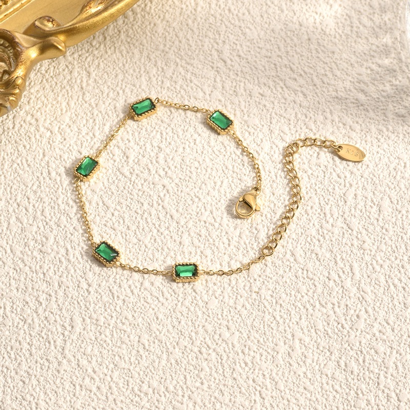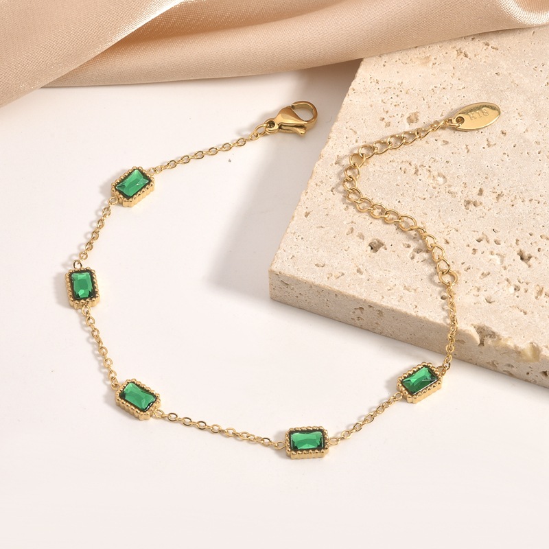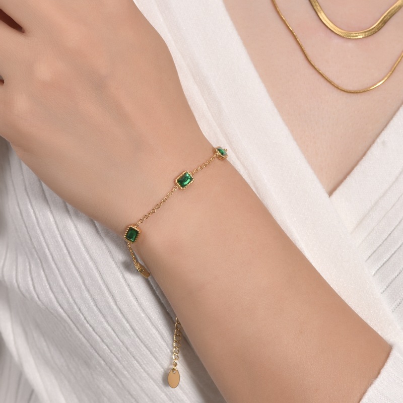 欧美跨境热卖款镶嵌祖母绿方形锆石手链真空镀金小众设计钛钢手饰