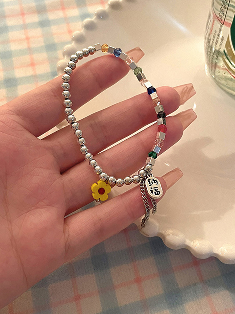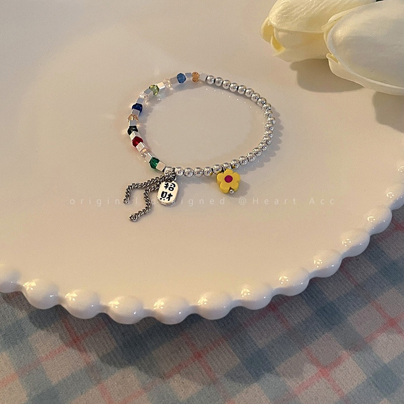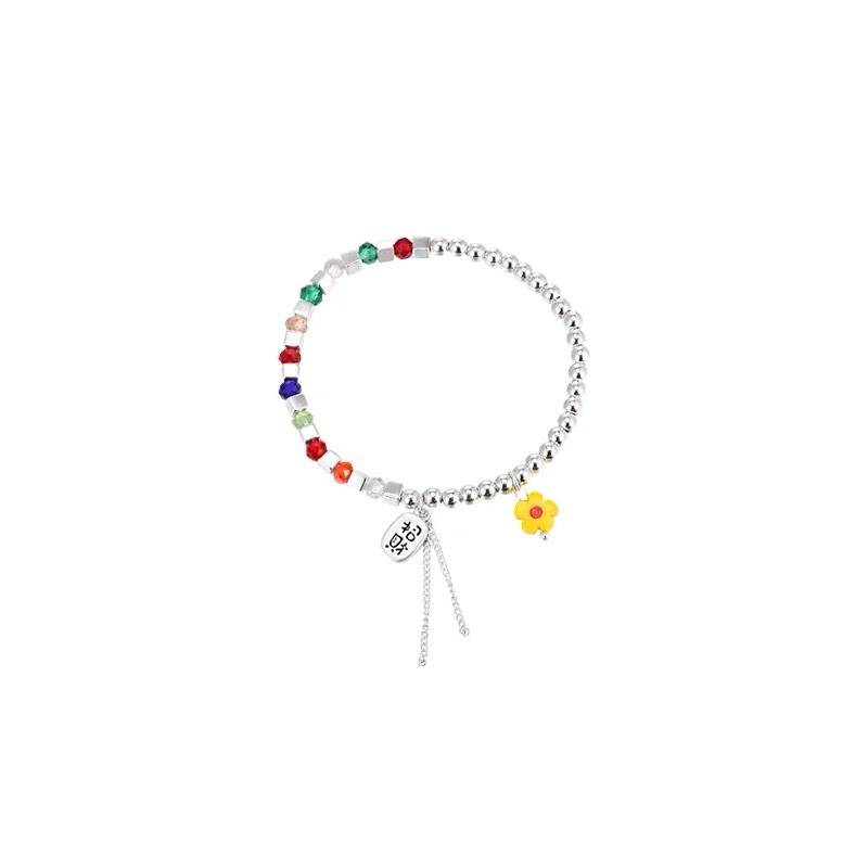 S925银招财花朵圆珠手链彩色水晶串珠手环时尚潮流个性手工手饰潮