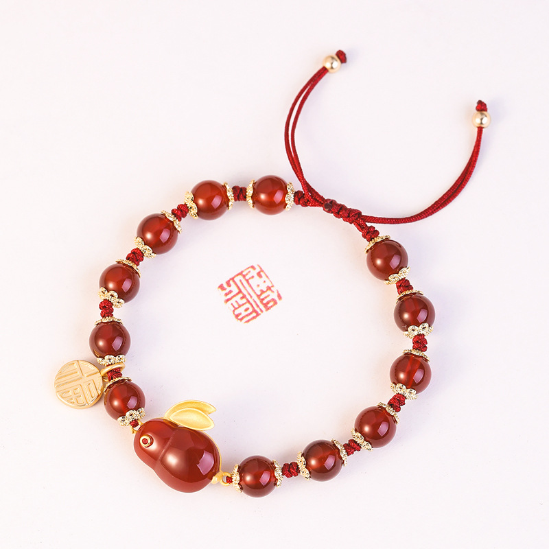 钱兔无量天然红玛瑙玉兔手链ins小众气质国风复古手工编织红手绳