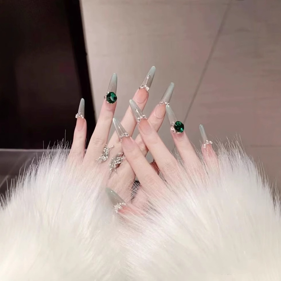 手工穿戴甲绿宝石法式猫眼冰透感甲片纯欲风爆闪绿钻珍珠显白美甲