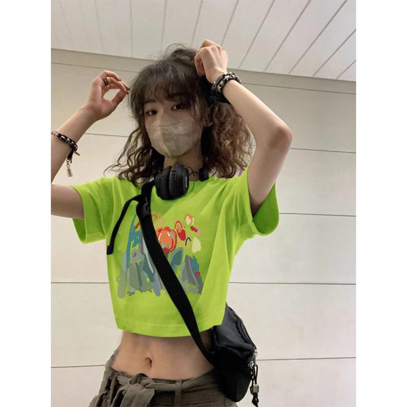 美式荧光绿甜辣短袖T恤女夏季新款氛围感小衫百搭显瘦上衣
