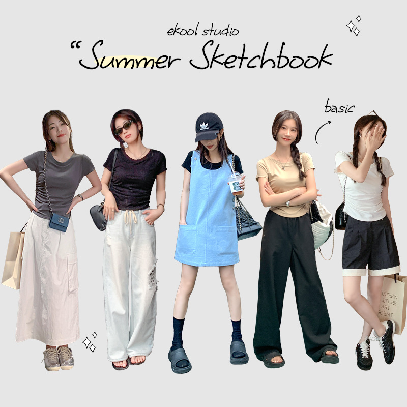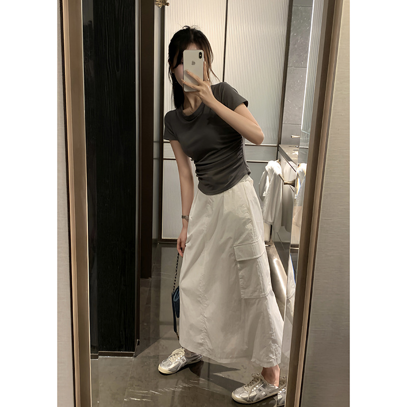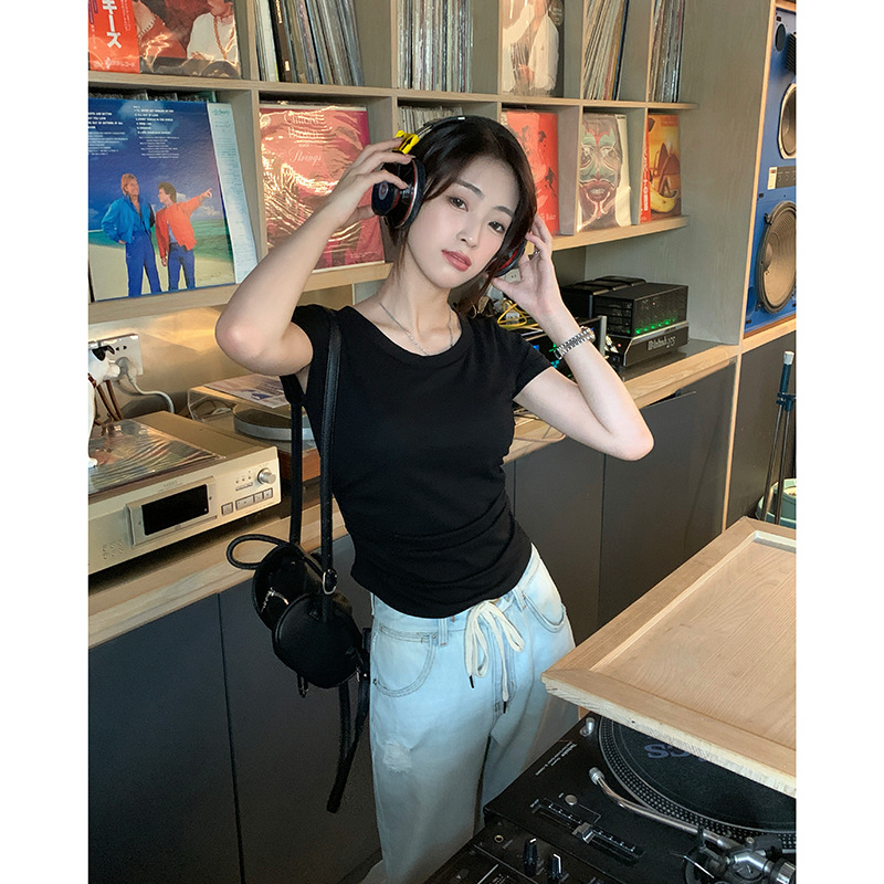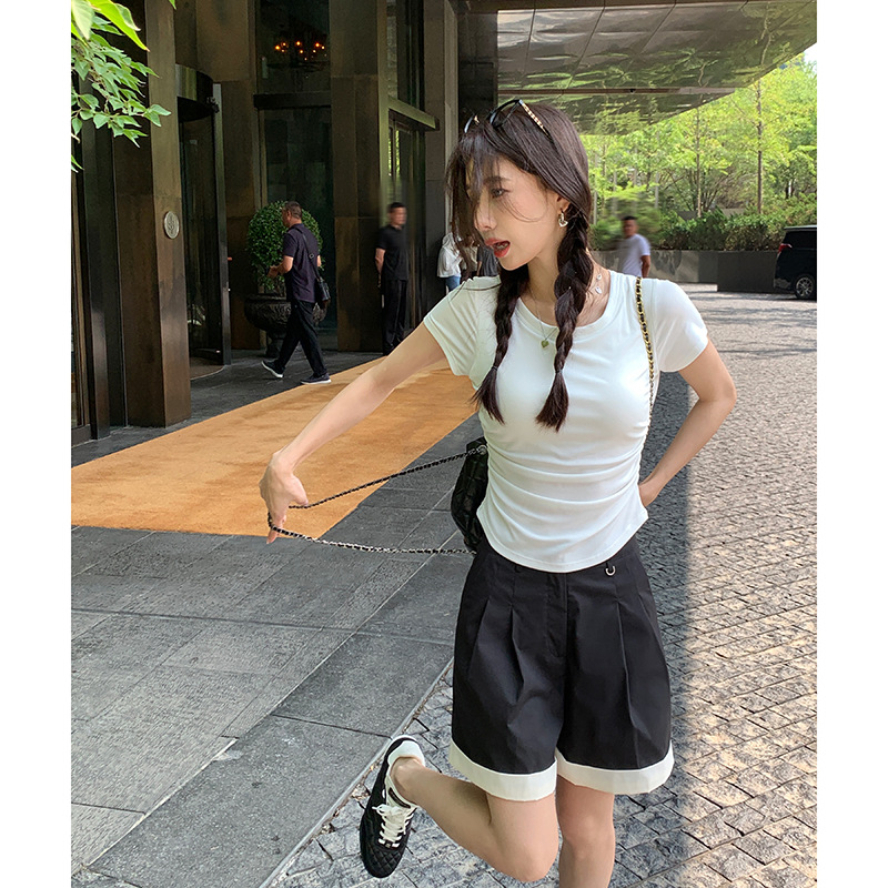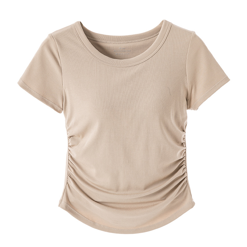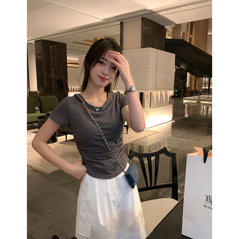 百视旺 带胸垫正肩短袖t恤女夏褶皱设计感收腰显瘦百搭短款上衣女