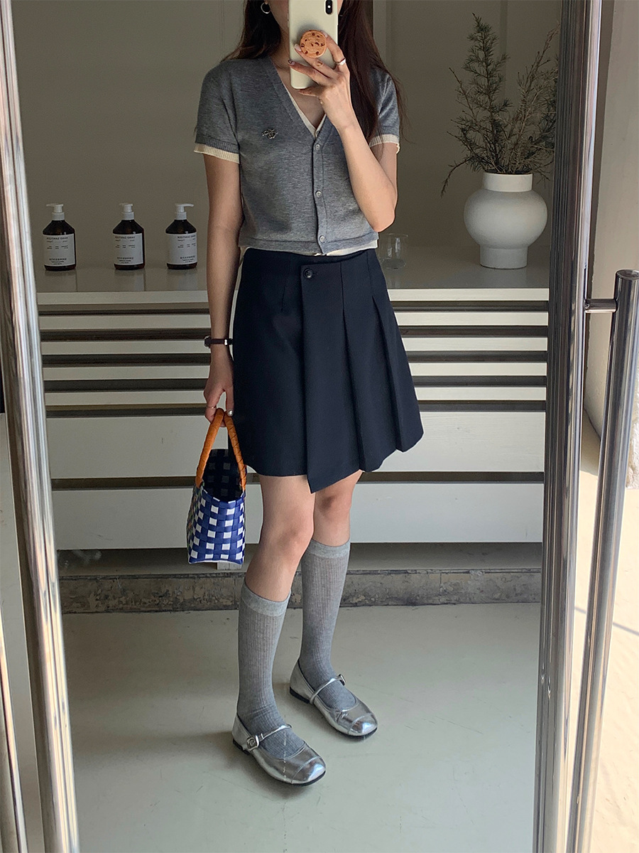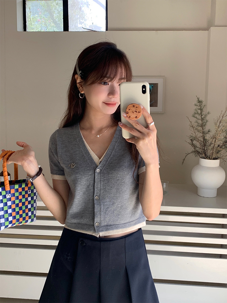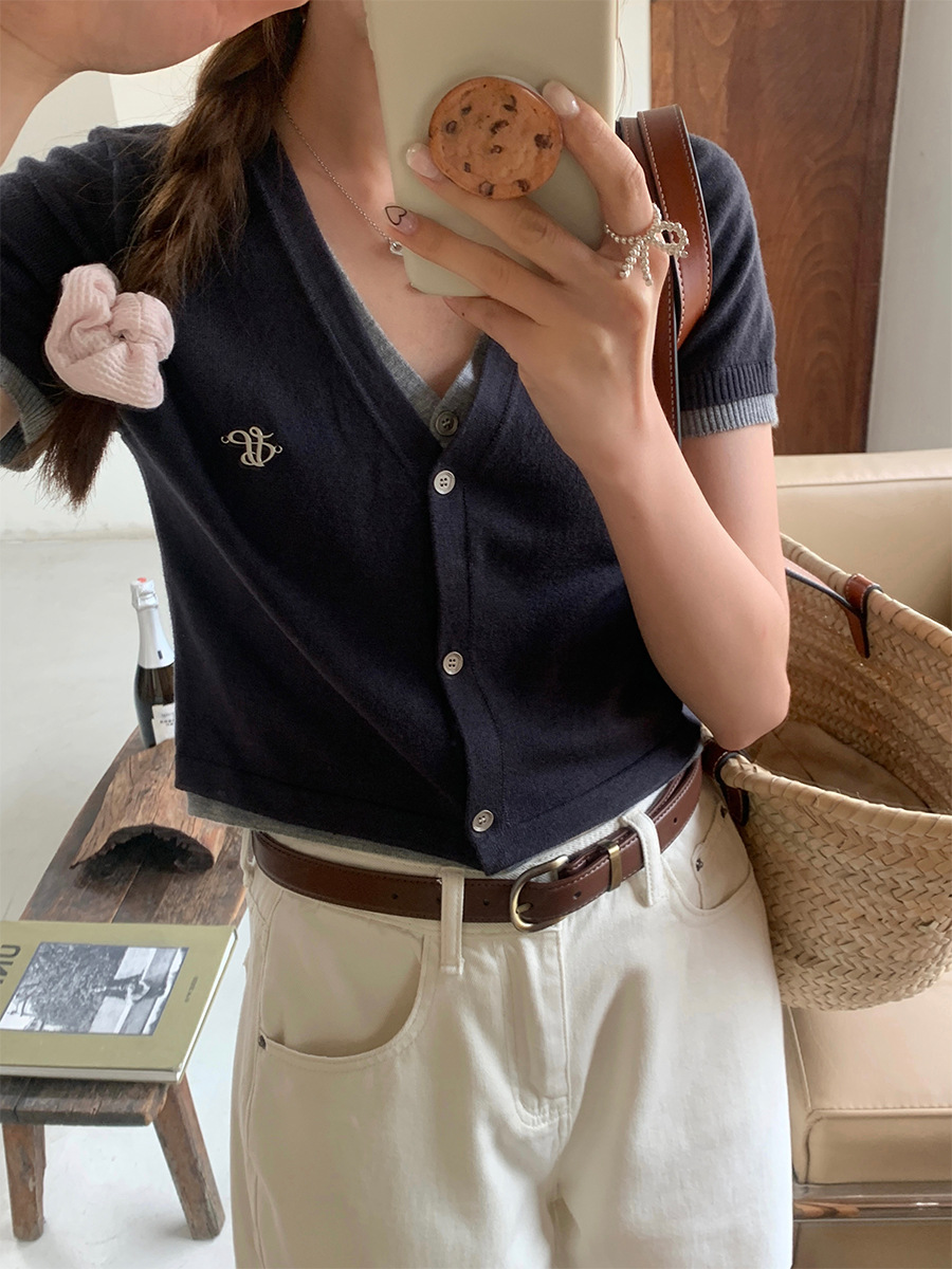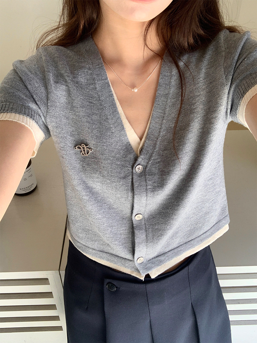黄峥 假两件V领短袖针织衫女夏小众短款撞色开衫上衣142MH219