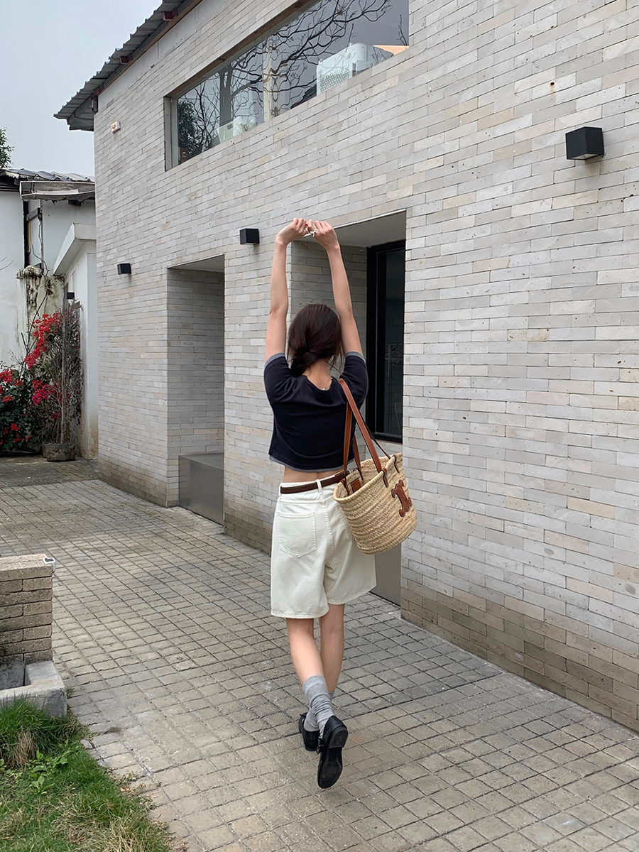 爆款纯棉短款小个子夏季新款修身V领刺绣短袖t恤女别致小众设计感