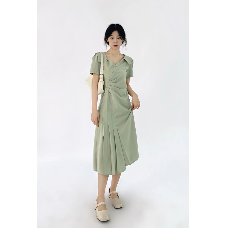 绿色V领褶皱短袖衬衫连衣裙女夏小众设计高级感收腰显瘦polo长裙