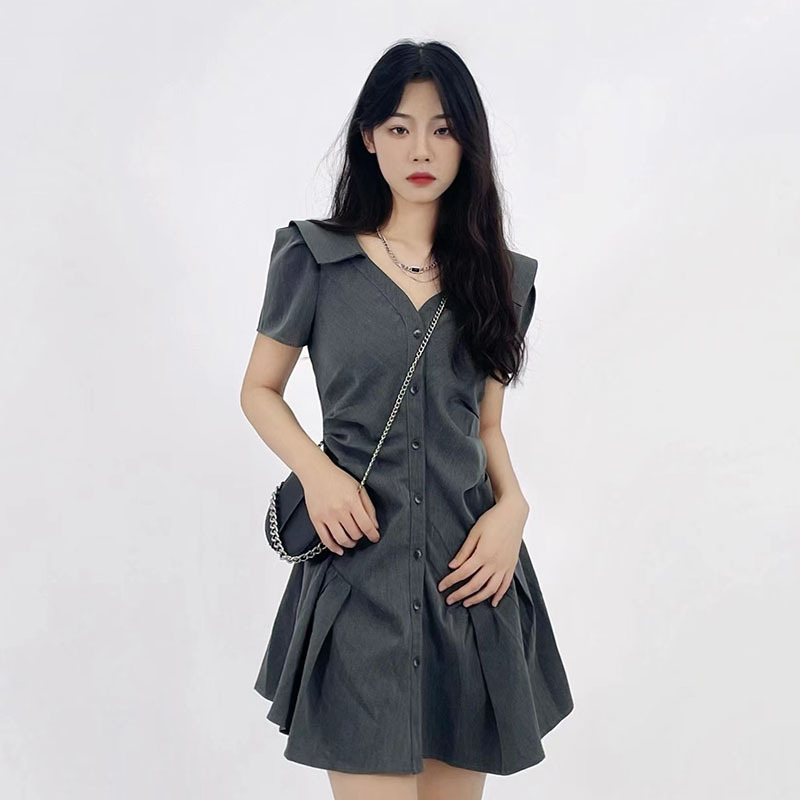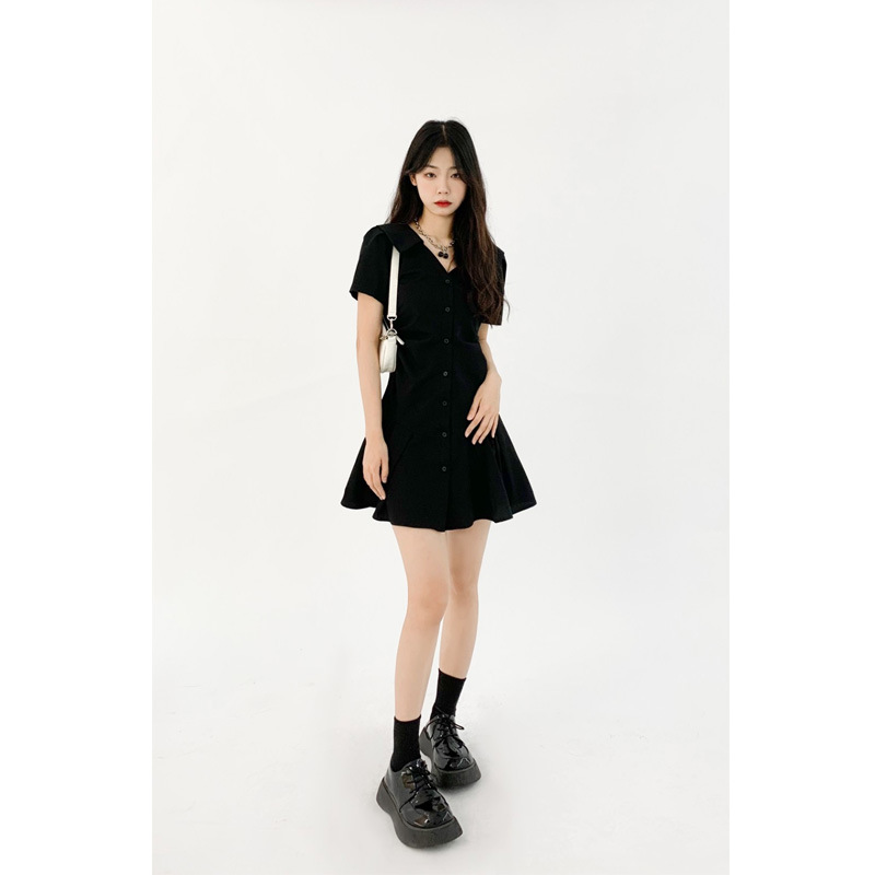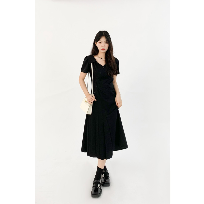 - 黑色短款【甜辣裙/衬衫裙/polo裙/百褶/开叉/V领/炸街裙子爆款2022/夏天/温柔风/时尚/纯