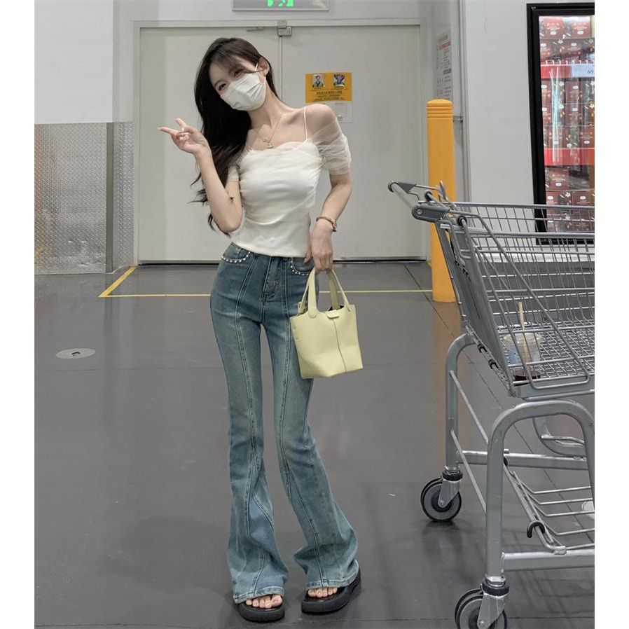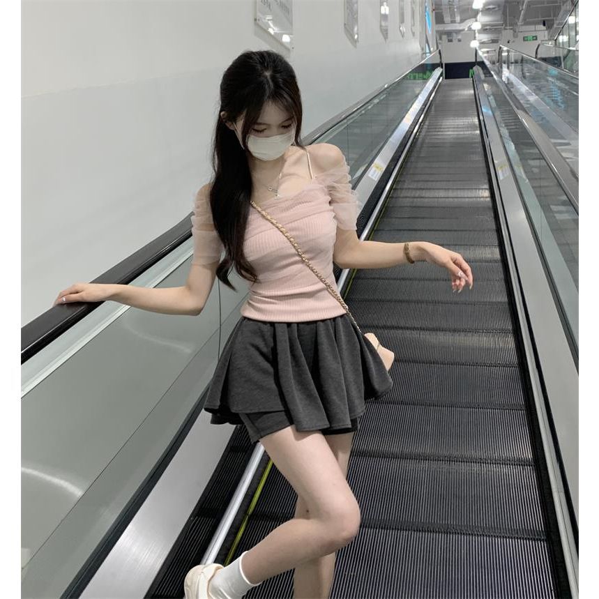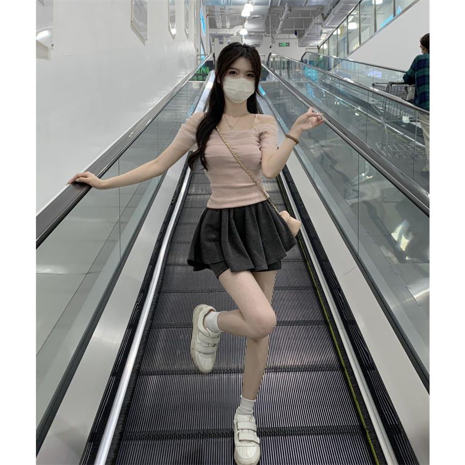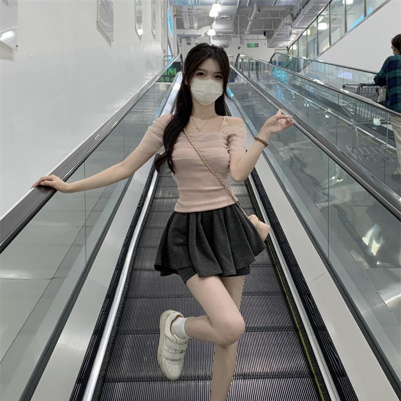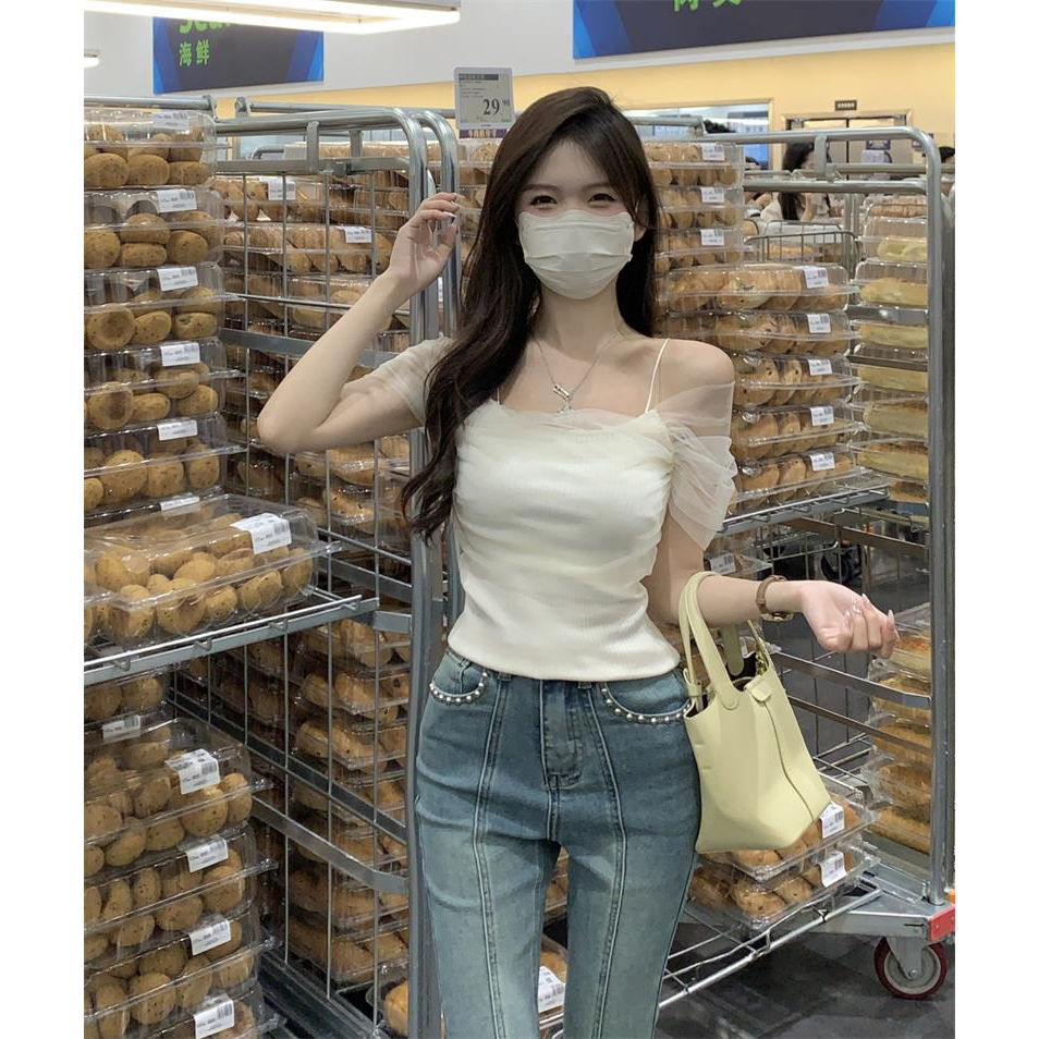 一字领吊带t恤女夏小众小个子法式甜辣妹上衣女夏网纱露肩短款女