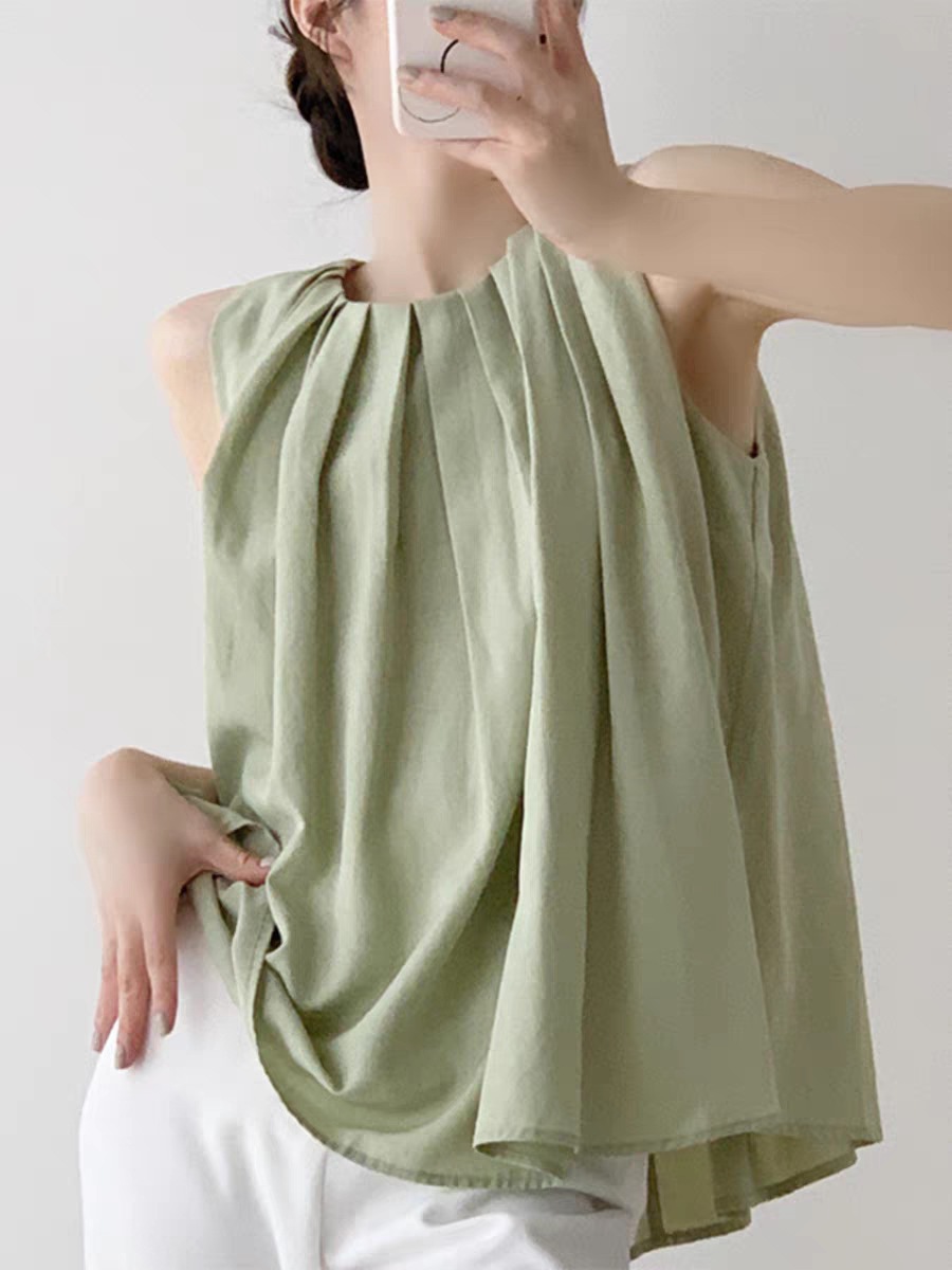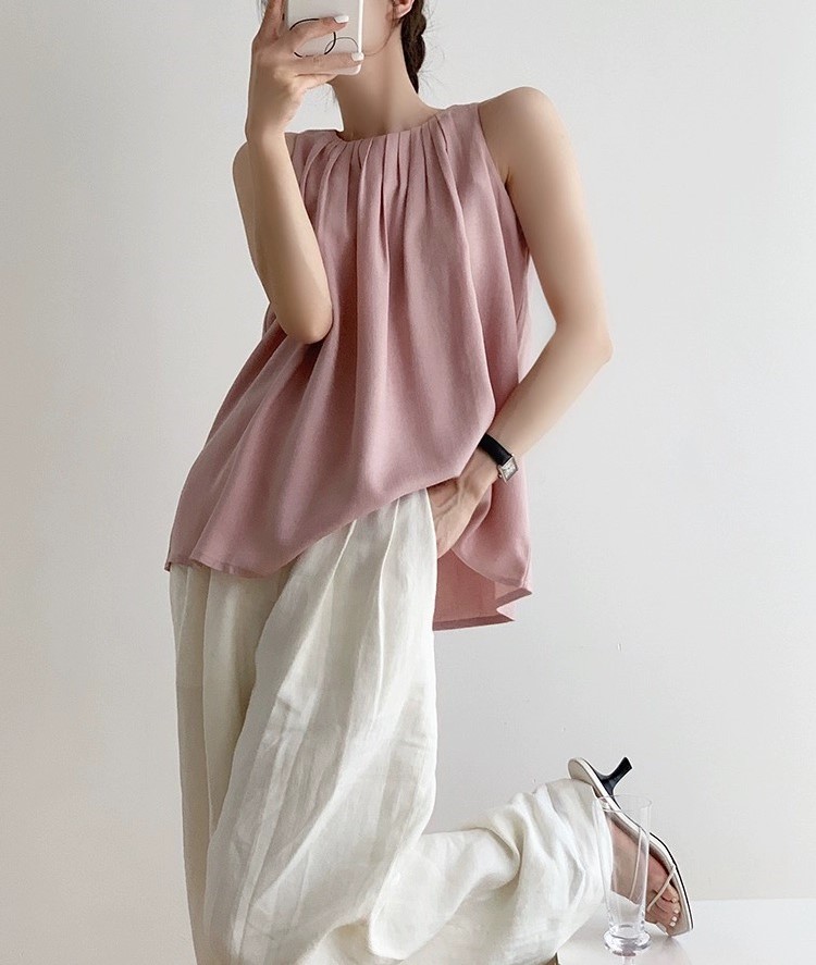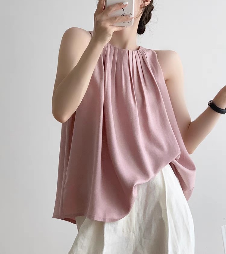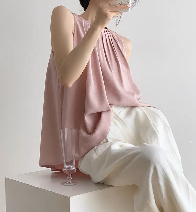 法式甜美粉色醋酸仿麻透气褶皱削肩背心女夏小众气质挂脖无袖上衣