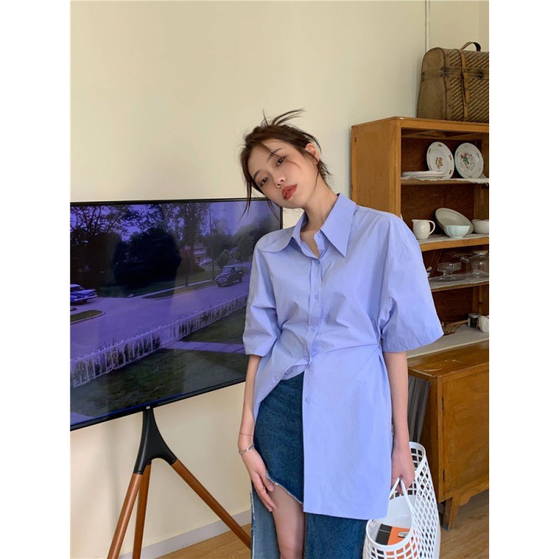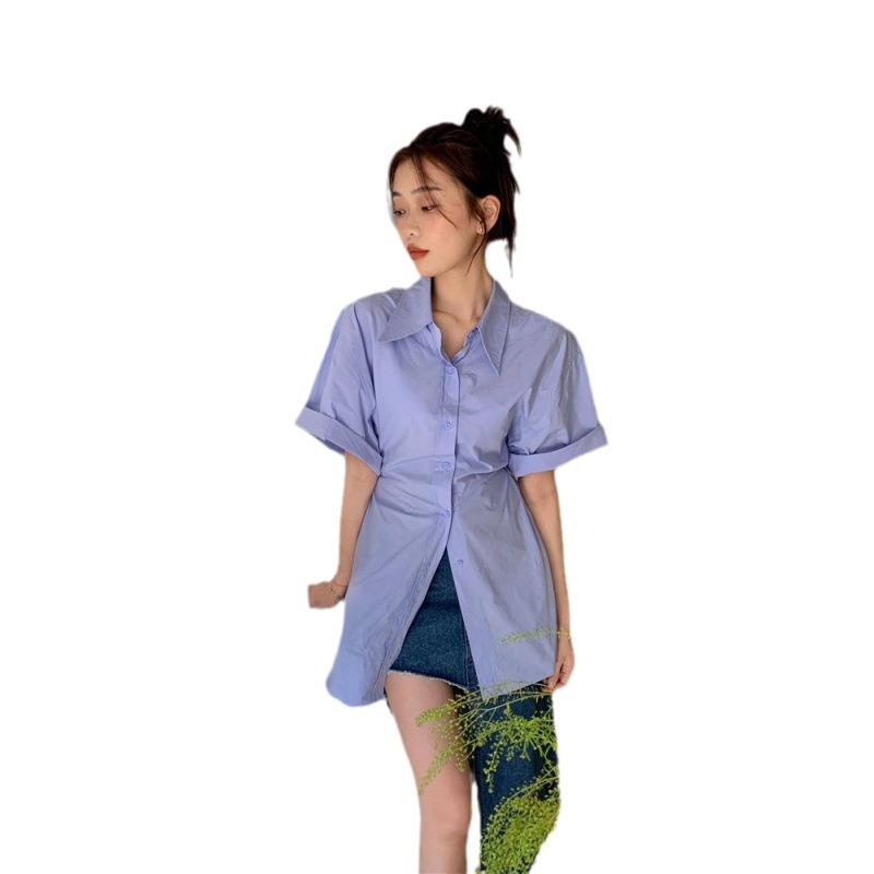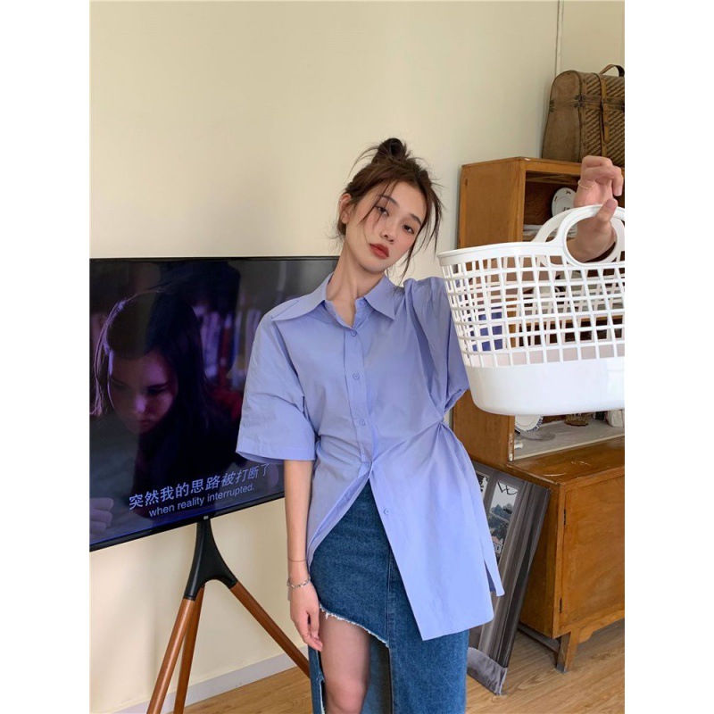 学院风收腰显瘦设计感衬衫女韩式中长款短袖衬衣夏小众别致上衣潮