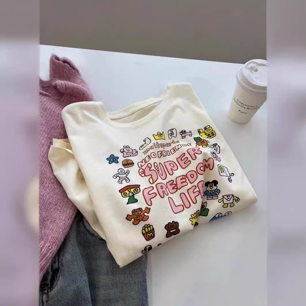 韩版可爱卡通印花圆领短袖t恤女宽松慵懒显瘦春夏减龄上衣潮