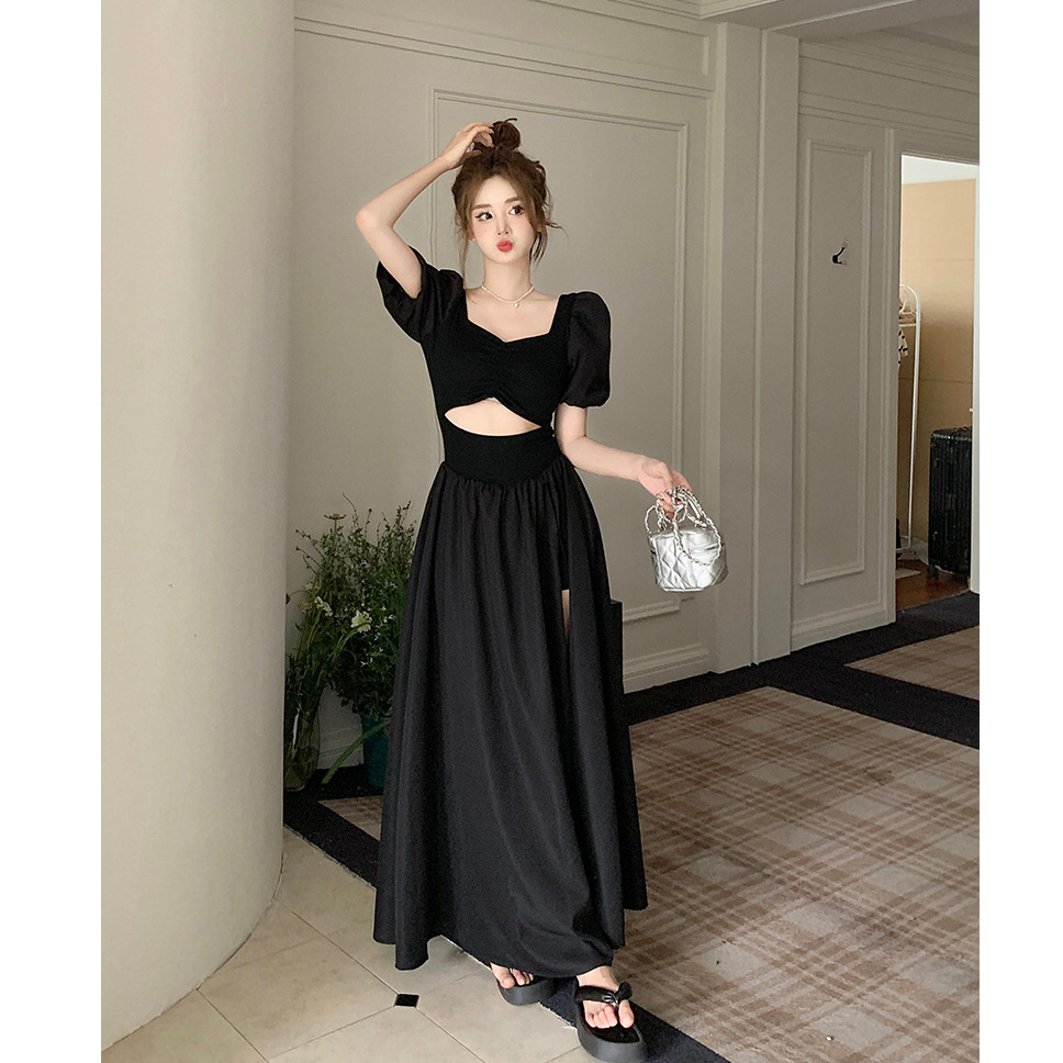 大码胖MM气质性感法式小黑裙女夏收腰显瘦连衣裙泡泡袖长裙子