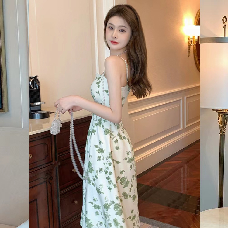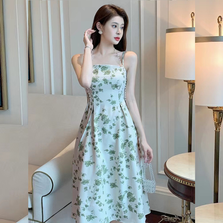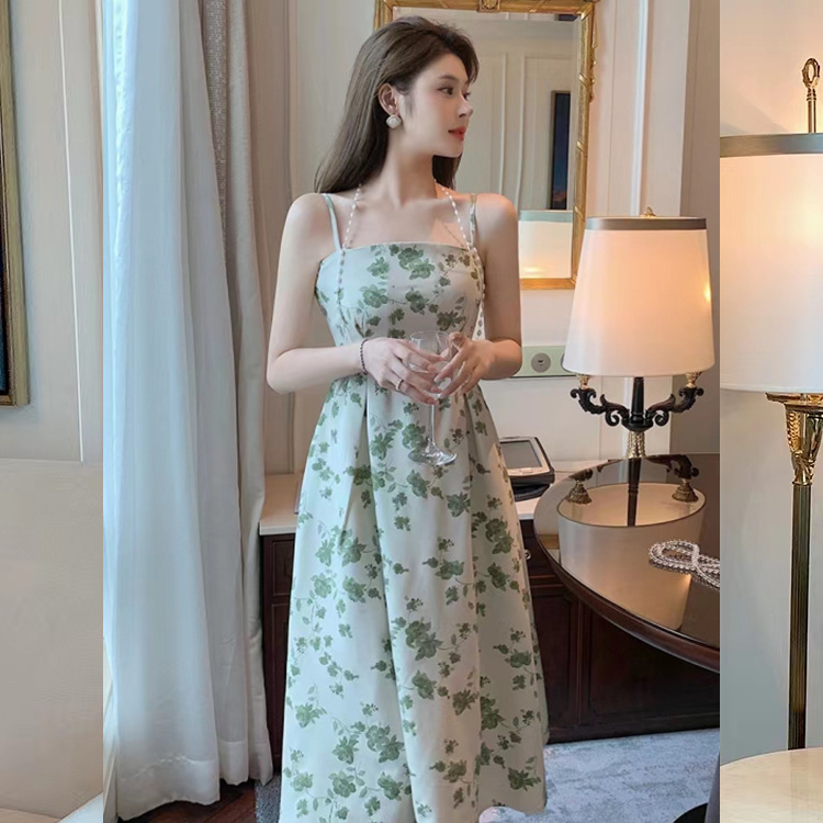 海边度假珍珠挂脖吊带裙法式复古碎花中长款连衣裙女夏小众设计感