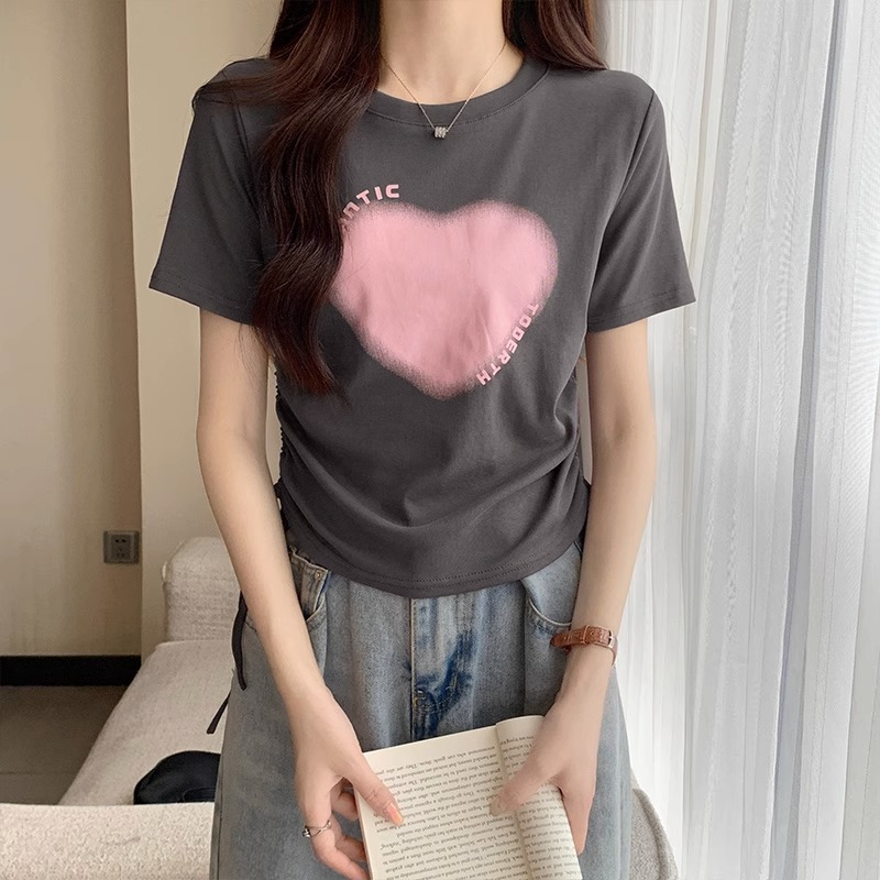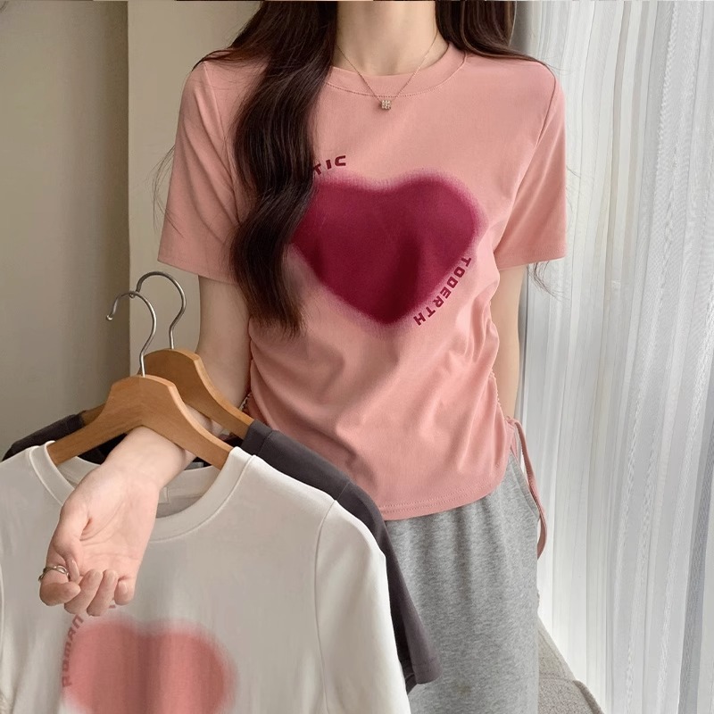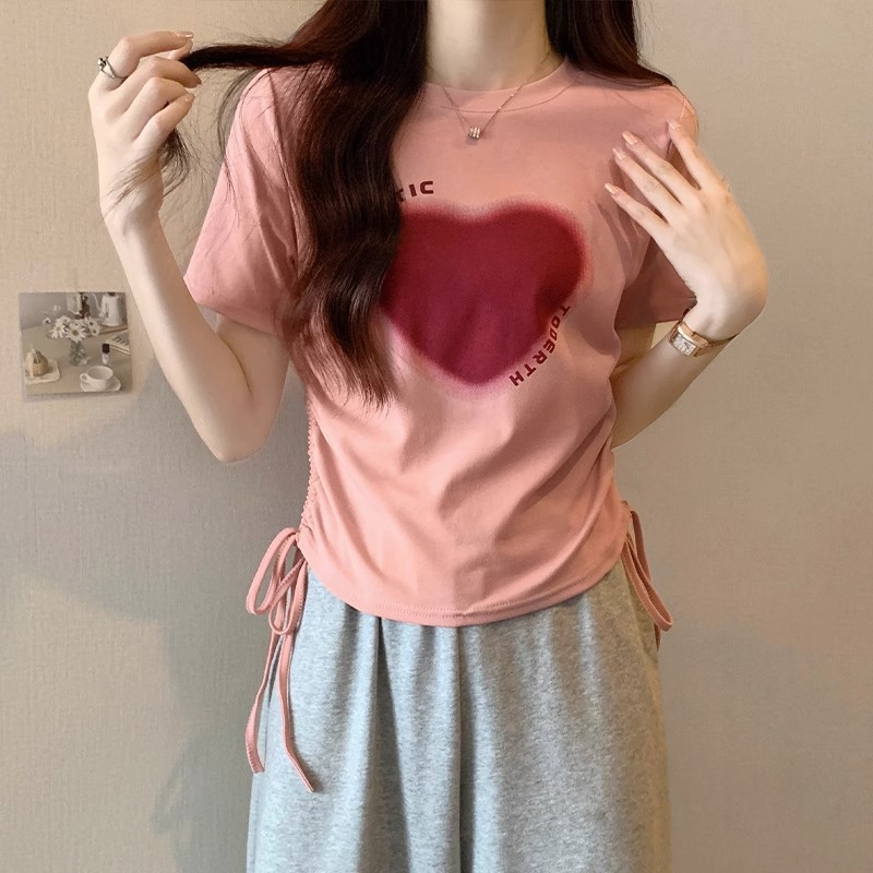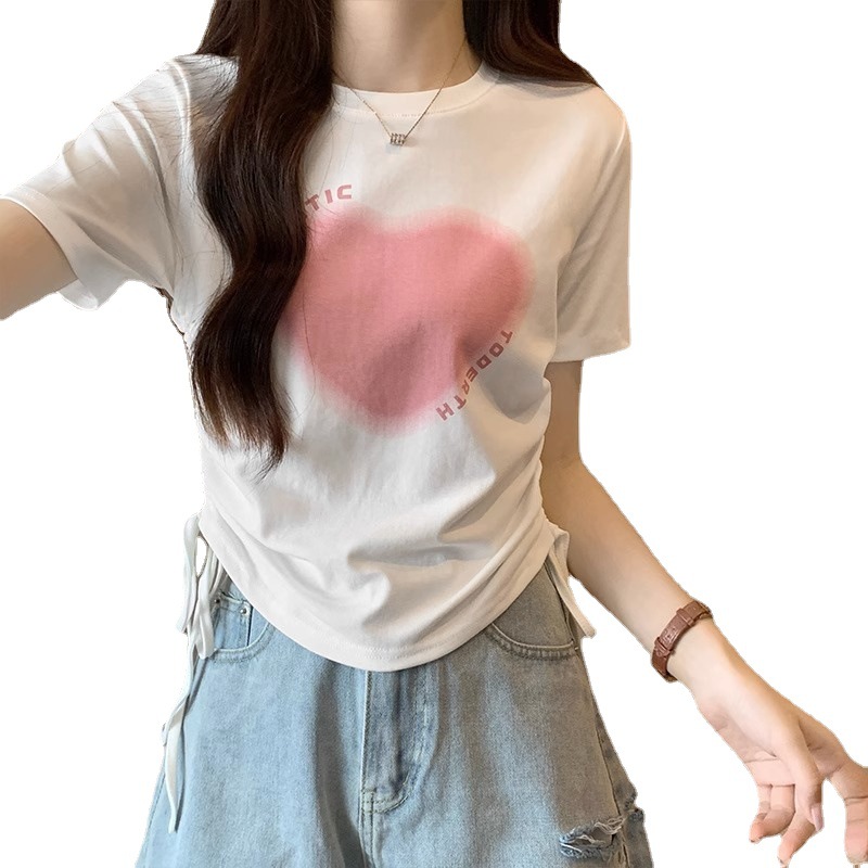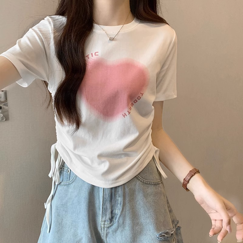 爱心印花正肩短款短袖恤女夏小众设计感抽绳收腰复古甜辣小上衣