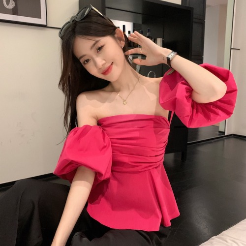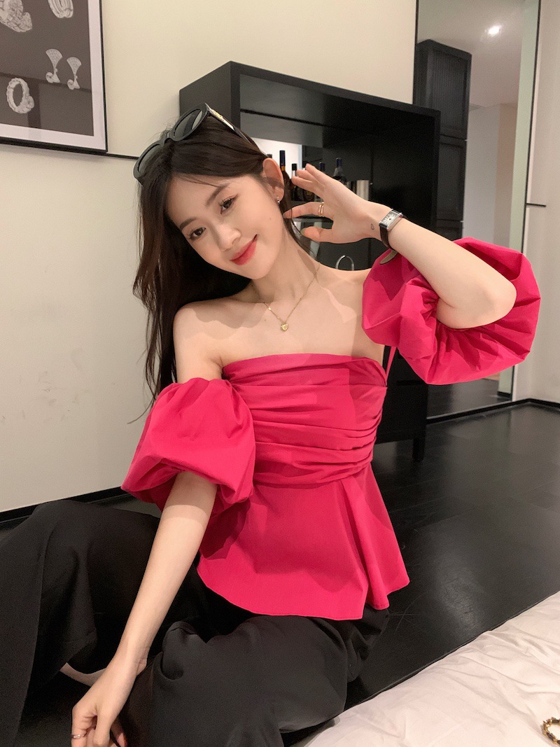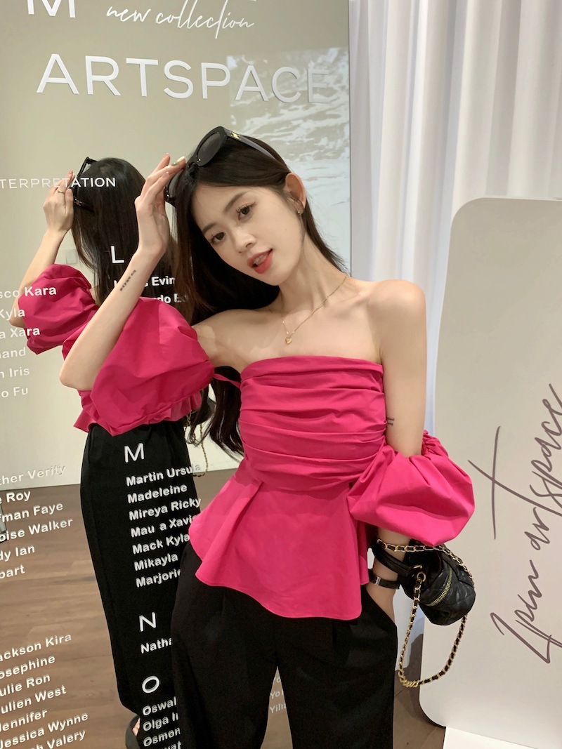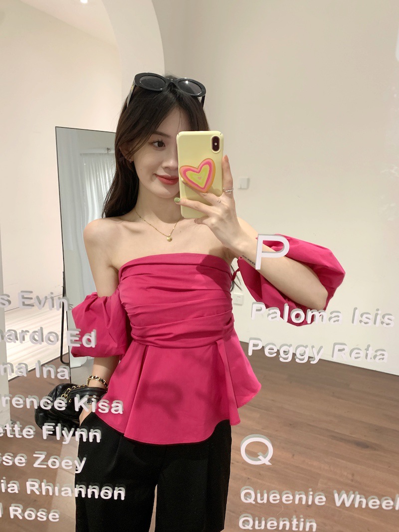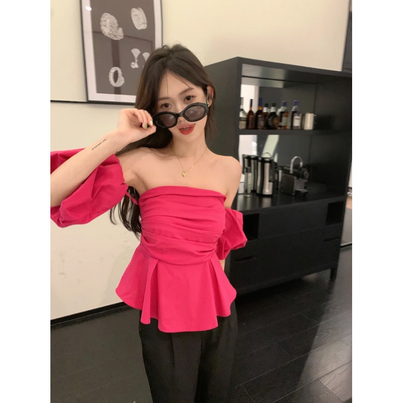 玫红色短款一字肩衬衫女夏小众设计感绝美法式泡泡袖收腰抹胸上衣