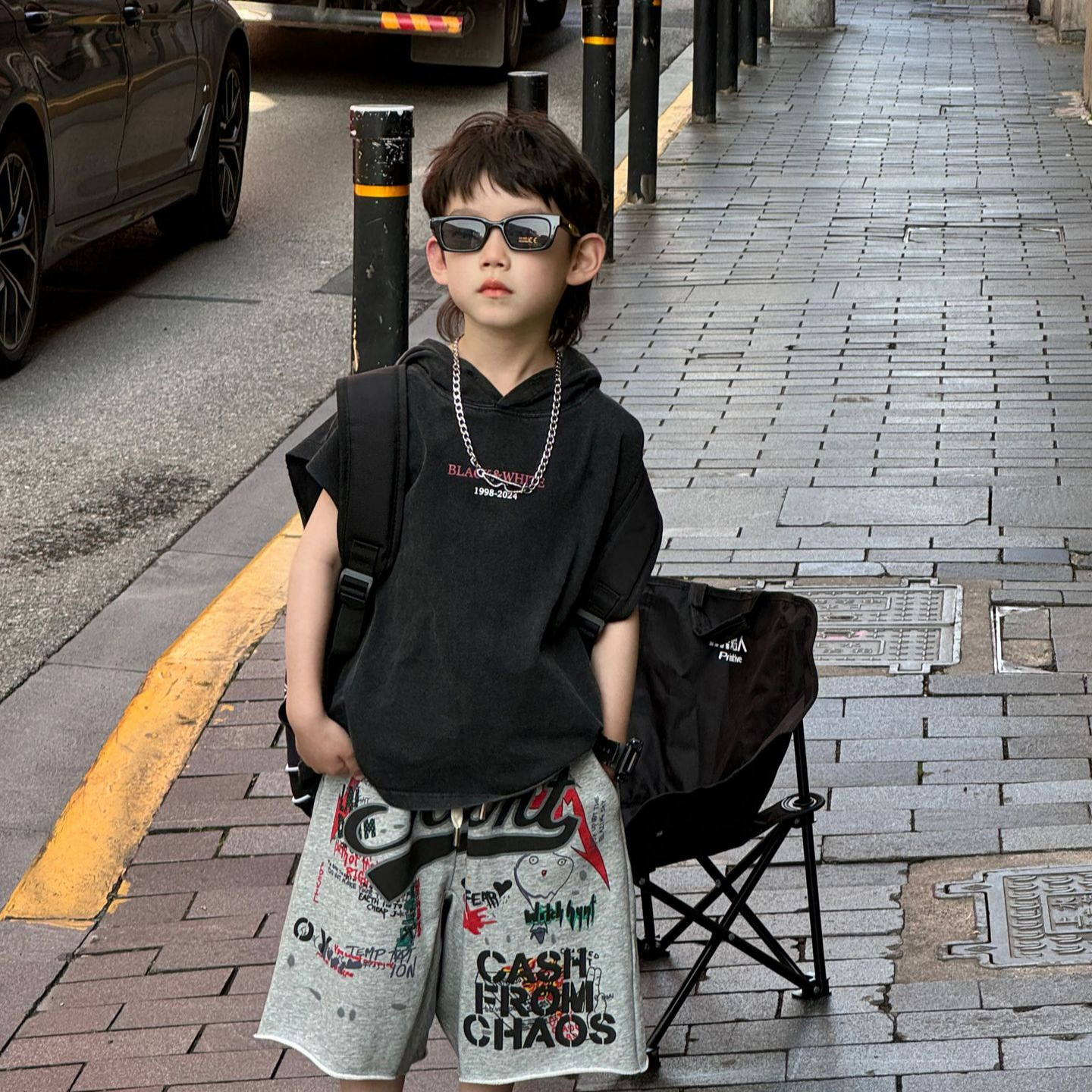 泰如夏季新款韩版男童百搭潮酷美式印花无袖连帽T恤儿童上衣