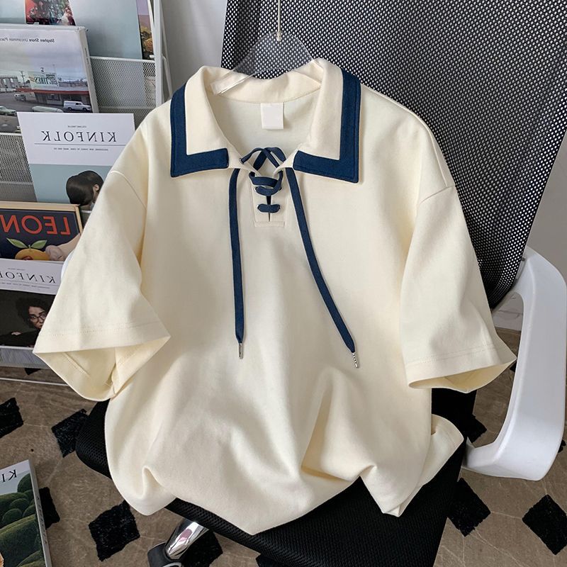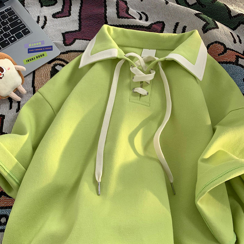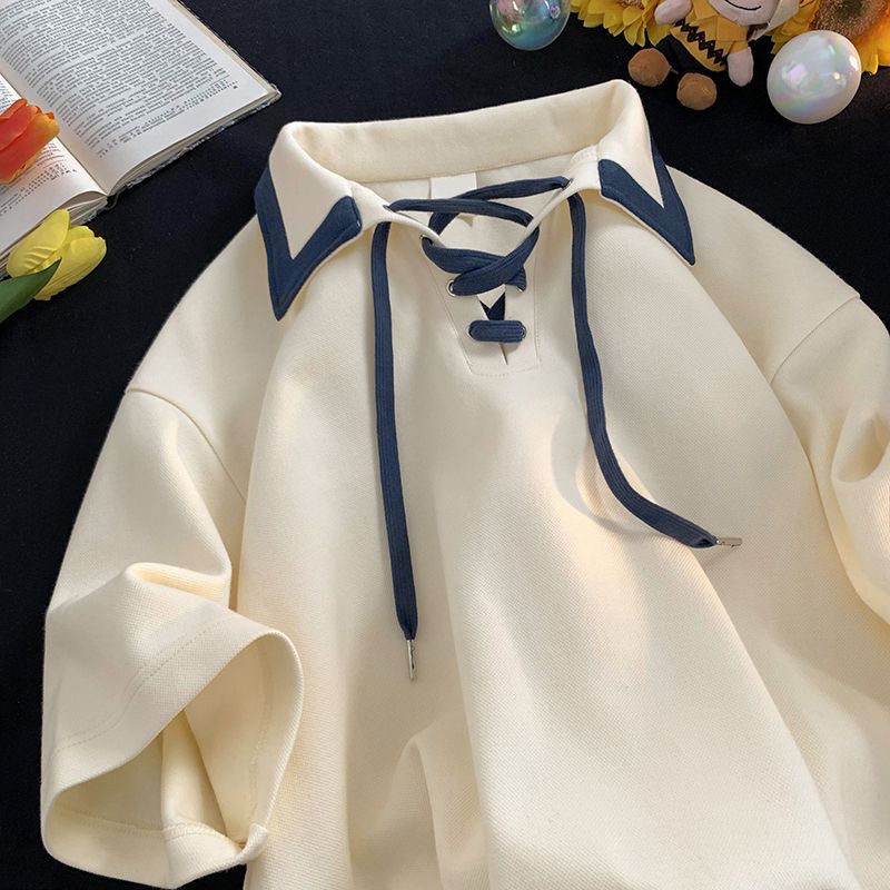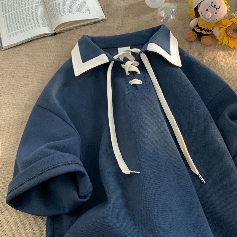 大码300斤日系复古POLO领衫短袖T恤女夏小众设计感半袖上衣