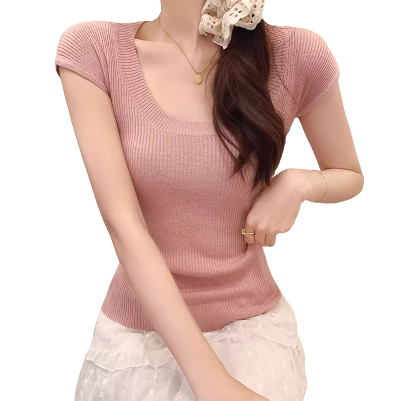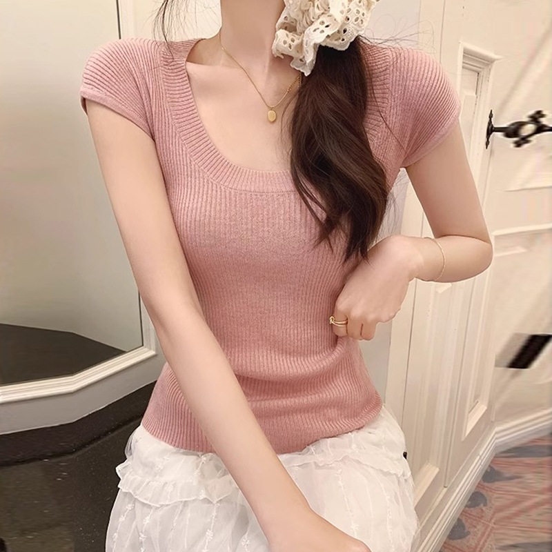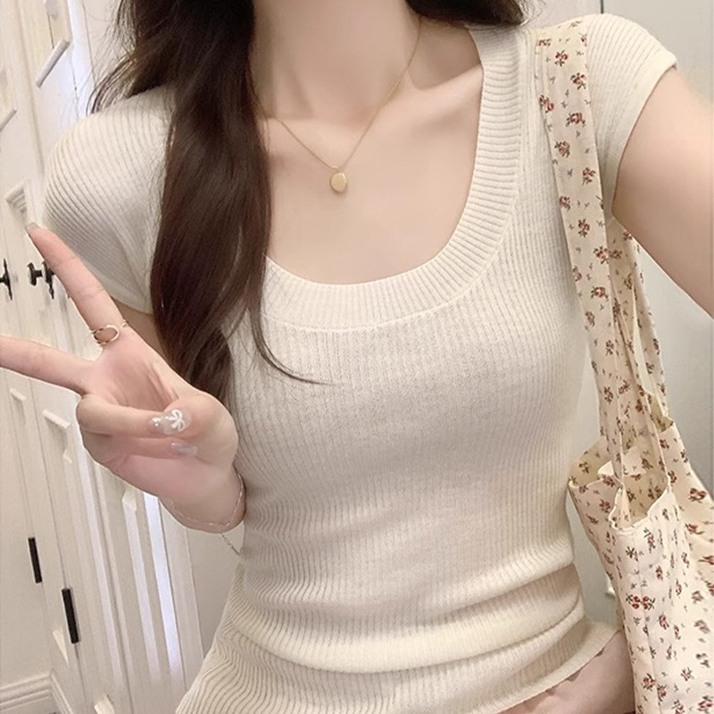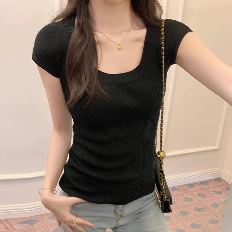 新款收腰显瘦短袖t恤上衣女夏小众设计感辣妹短款修身针织衫